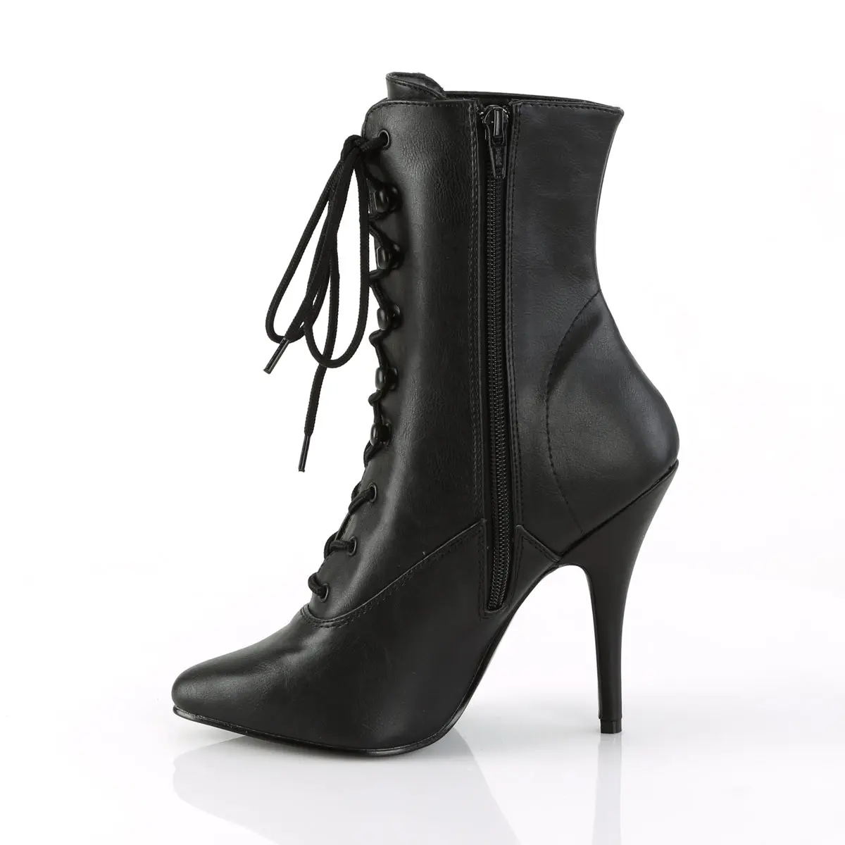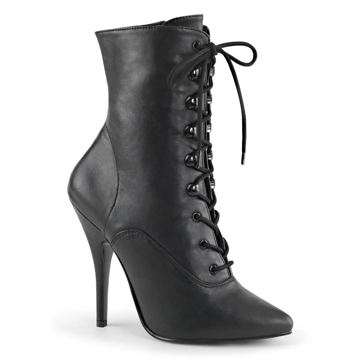Step into the spotlight with the Seduce-1020 ankle boots, crafted from premium black vegan leather for a sleek and sophisticated look. These boots feature a striking 5-inch heel that complements the lace-up front, offering a classic yet bold style. A convenient full inner side zipper allows for ease of access, making them a practical choice for a variety of occasions where you want to stand out.