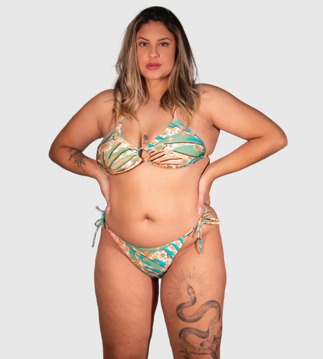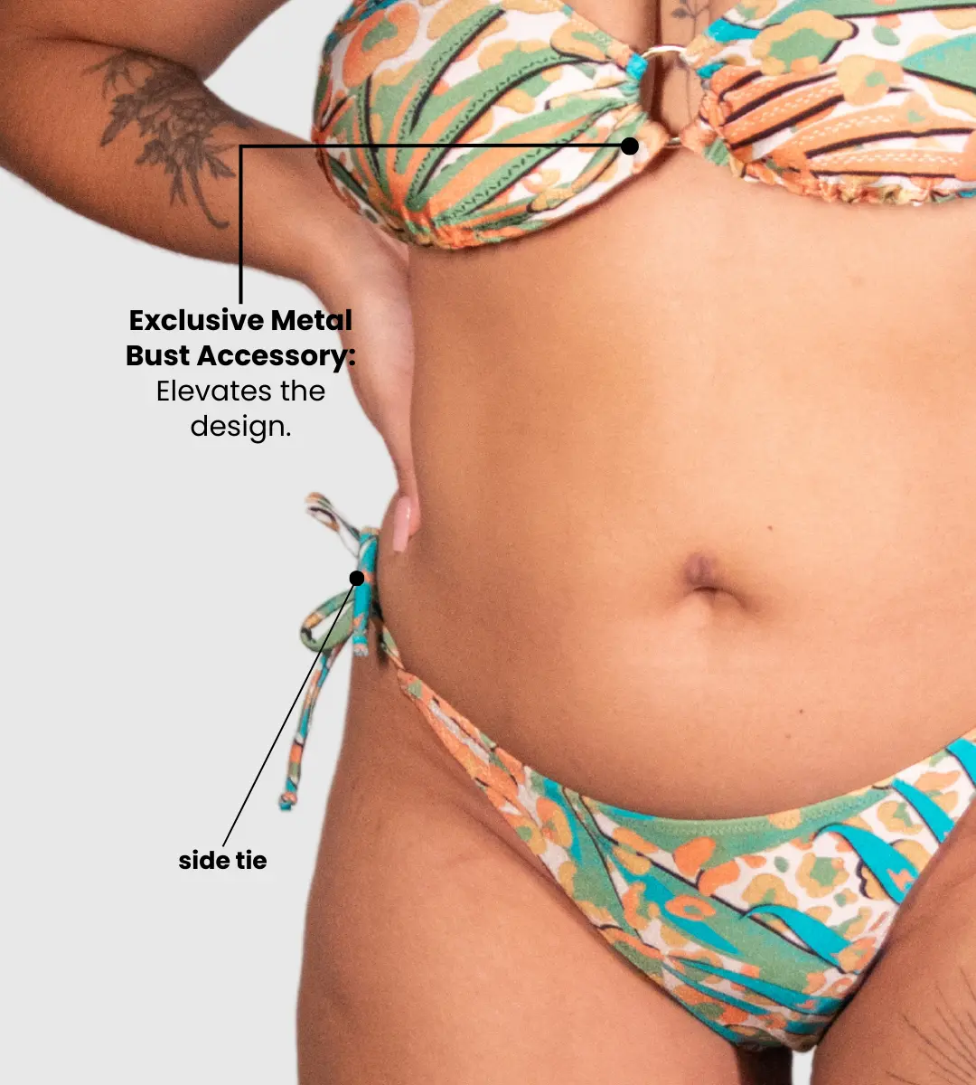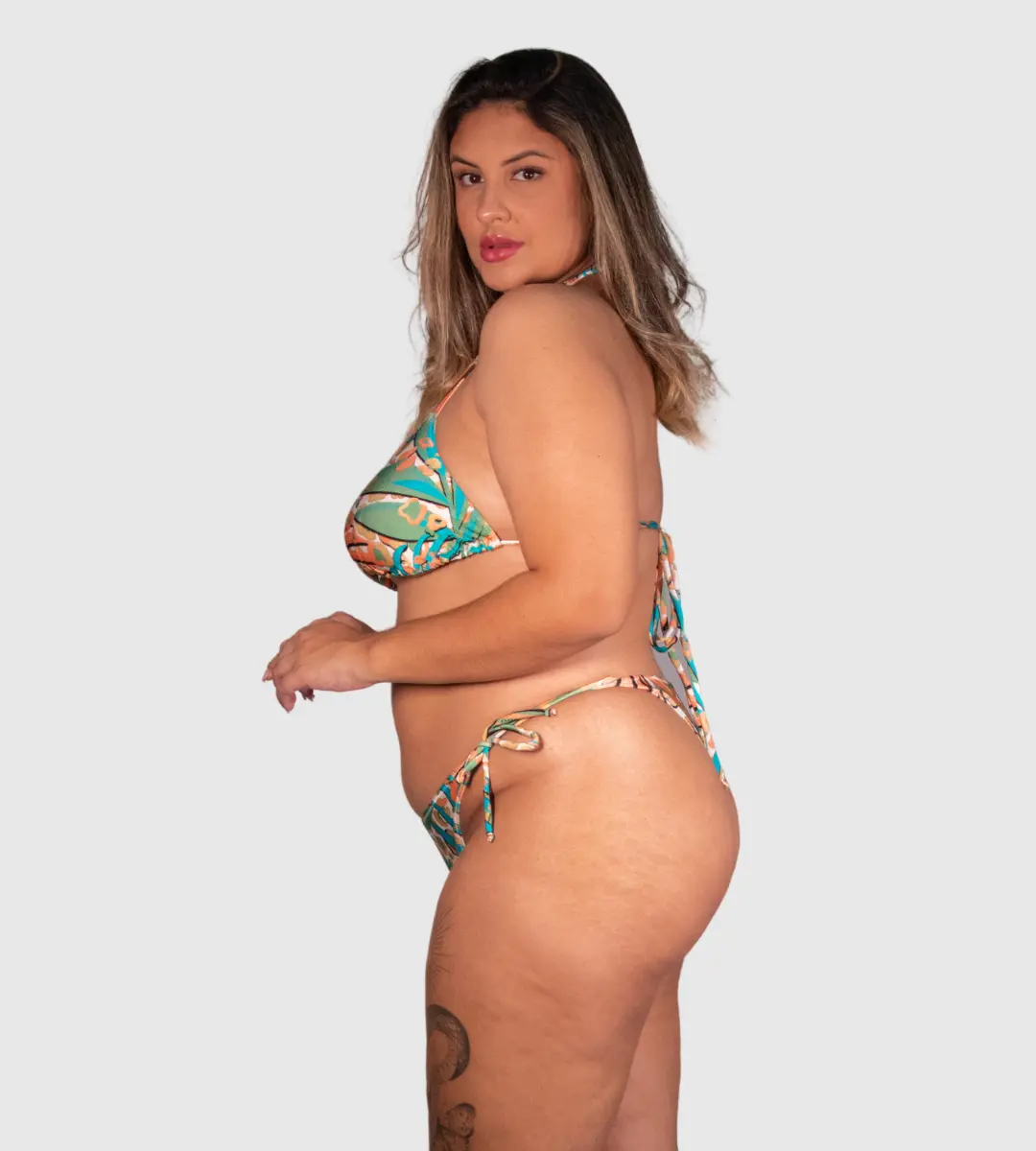 The Hiva Plus Size Bikini is the ideal choice for women seeking that perfect tan line without compromising on style. This bikini, featuring a Brazilian cut curtain-style top, combines daring and comfort. The G-string thong with side ties adds a bold touch, while the top, with wider and adjustable straps, offers unparalleled comfort. An exclusive metal accessory further enhances the bust, adding a unique flair.