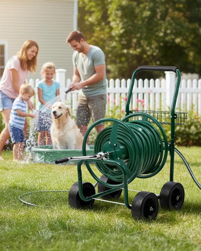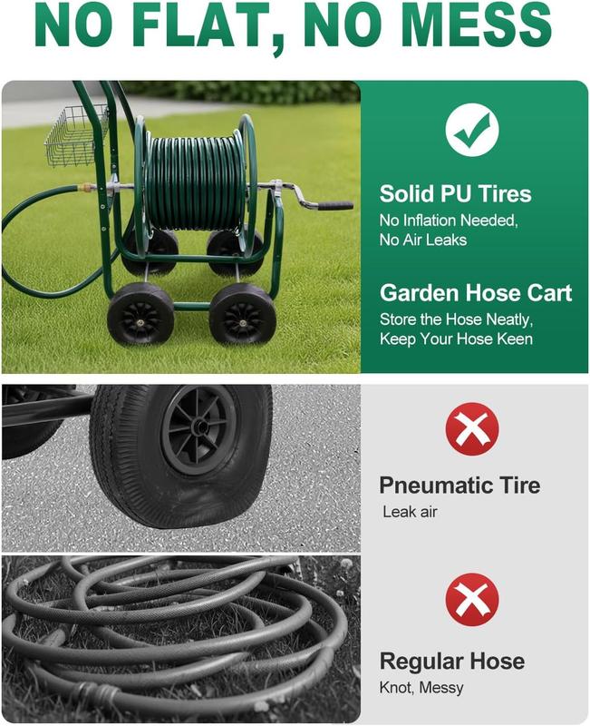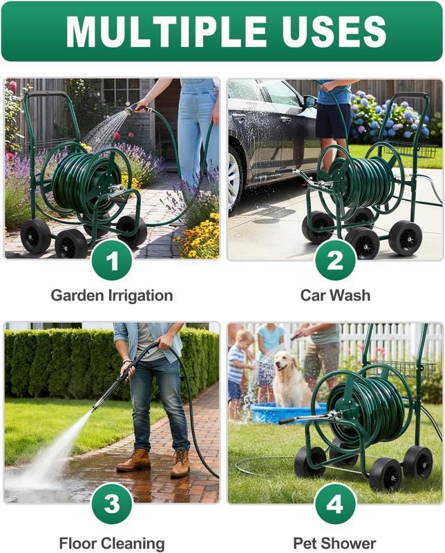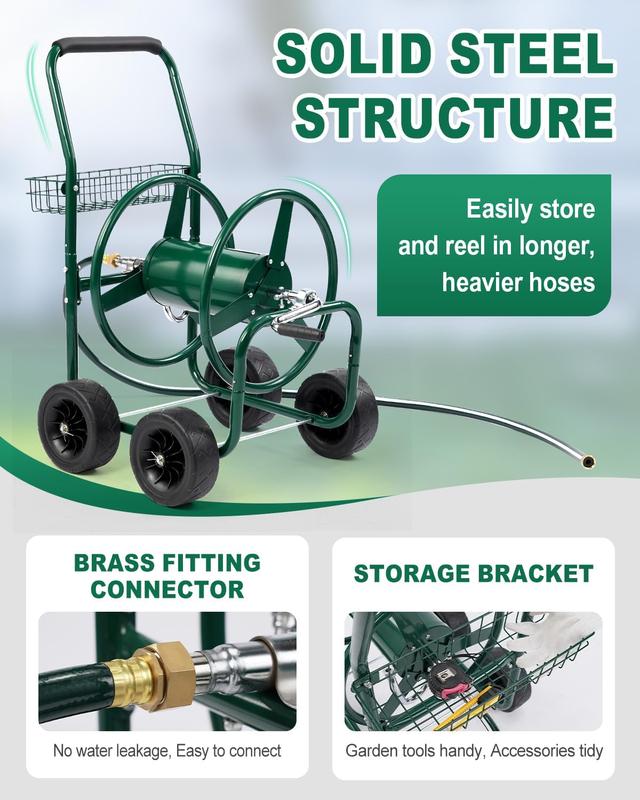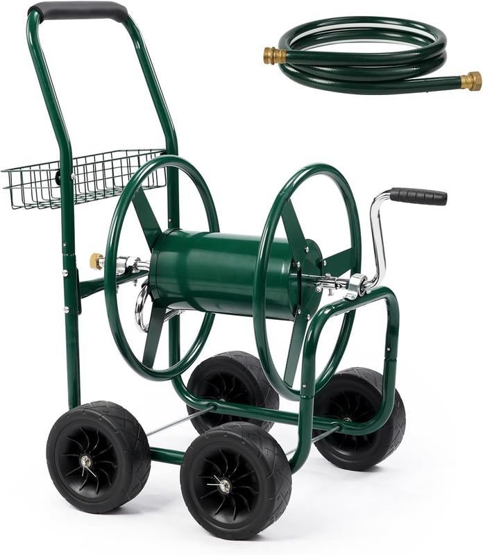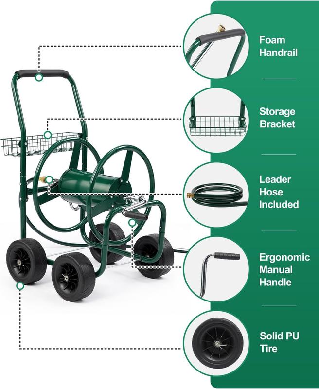 Our hose cart, featuring a heavy-duty metal frame, includes a storage bracket and a leader hose, and can hold up to 250 ft (5/8") of hose.
