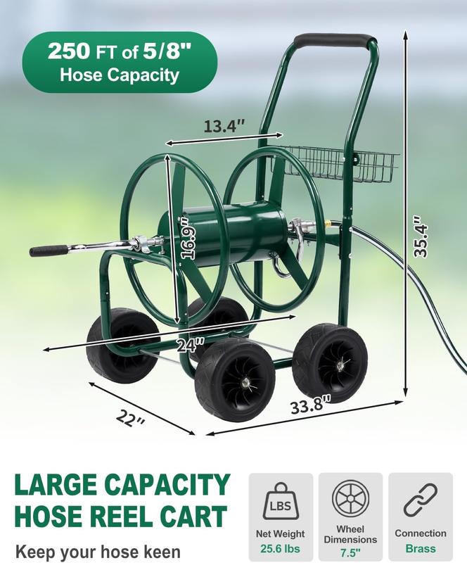 It can hold up to 250 ft (5/8") of garden hose, meeting most household and outdoor use needs.