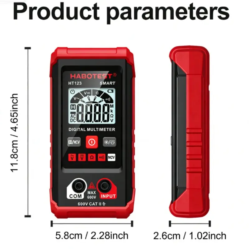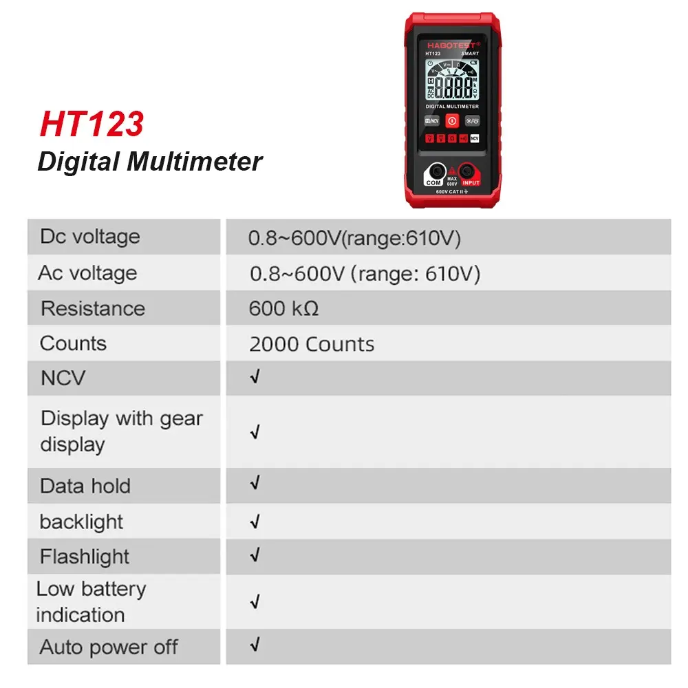 ● Complete common functions: non-contact voltage detection, switch buzzer, resistance measurement, data hold, automatic shutdown, low battery indicator, etc.