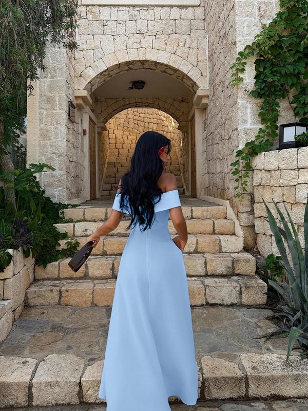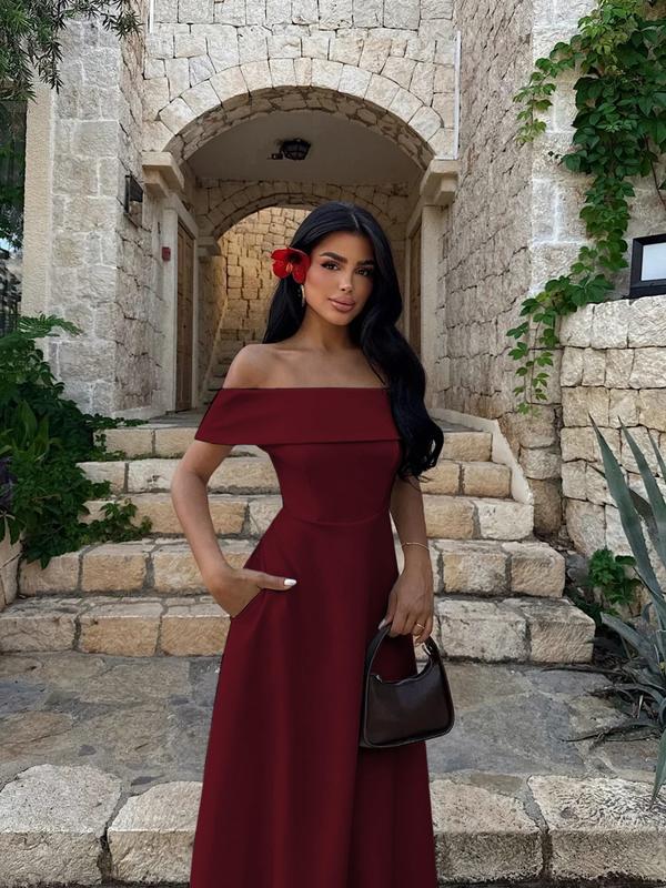 Elegant Off-Shoulder Dress with Waist Design, Simple and Classic Party Wear, Women's Stylish Evening Dress for Special Occasions