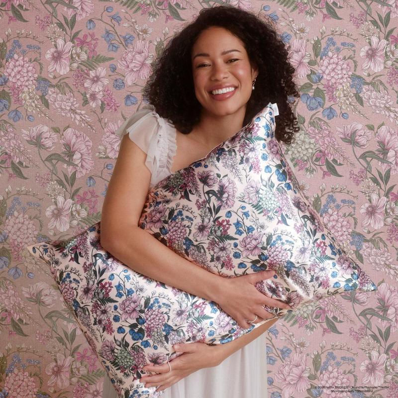 ·Satin pillowcase with a wisteria print on one side and a delicate, floral-edged design on the other—flip for romantic, Regency-inspired style.