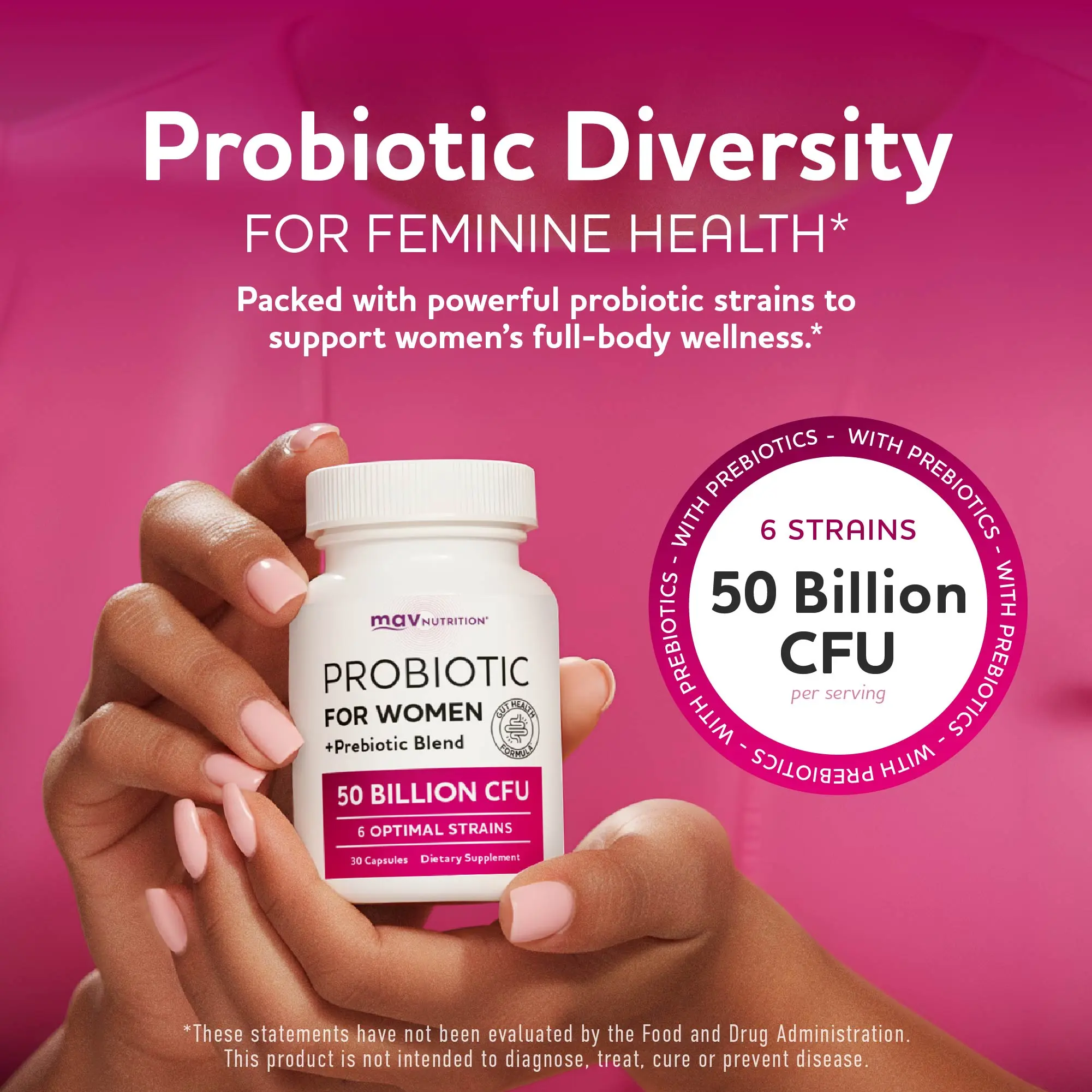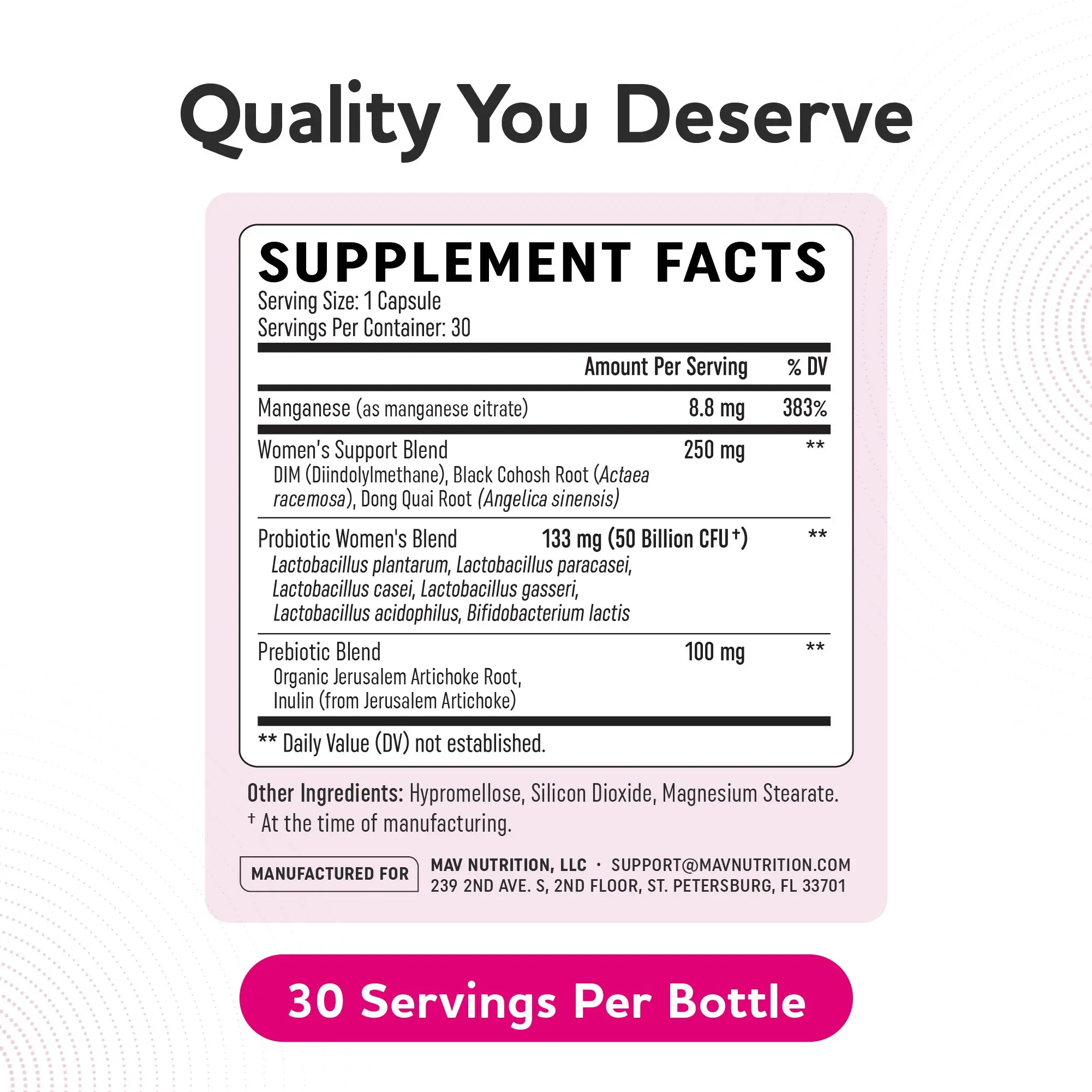 PROBIOTIC FOR WOMEN: At MAV Nutrition, we understand that women’s probiotic needs are unique. Ours is designed with the most effective prebiotics and probiotics for women, plus a hormone balance blend, for full-body female support.*