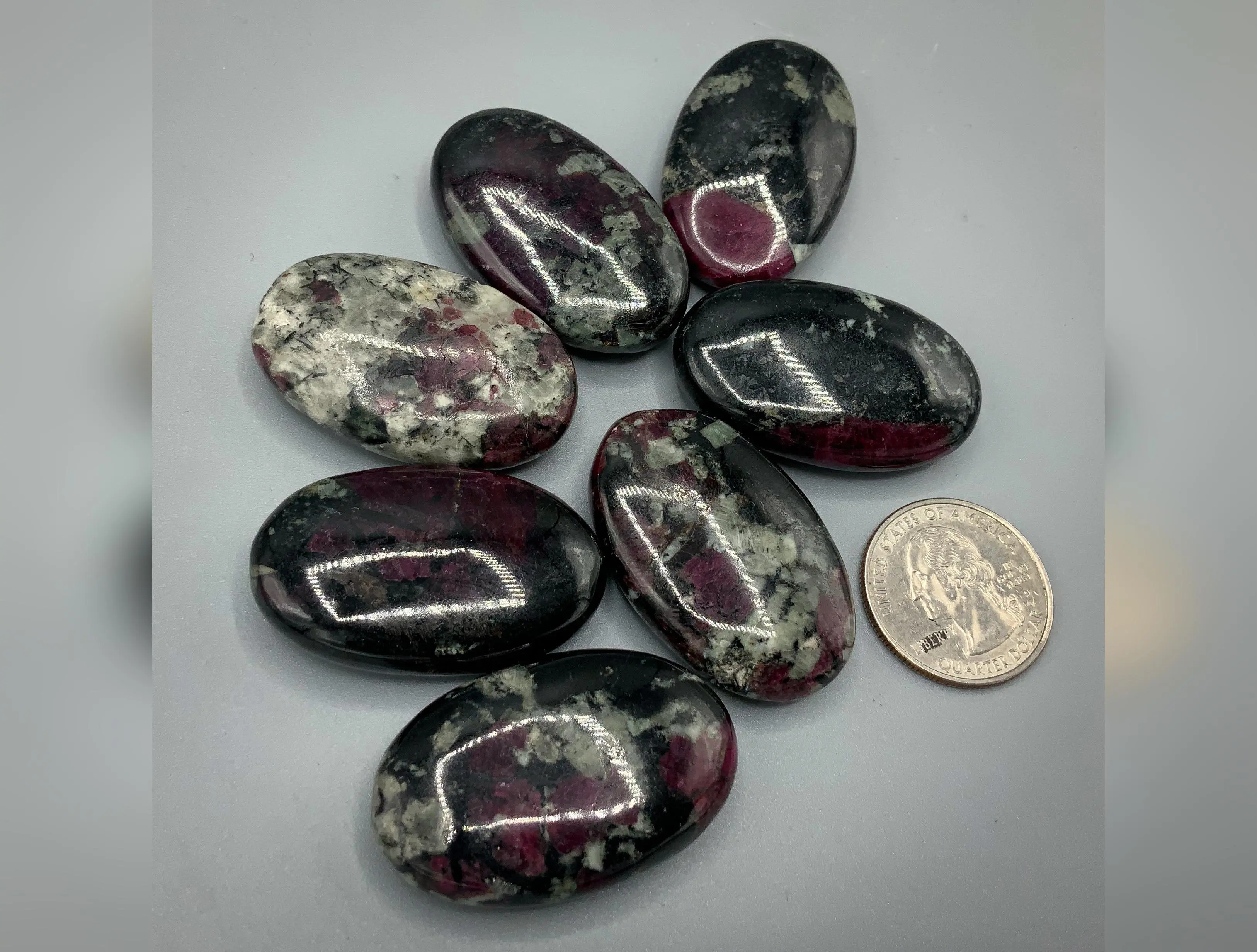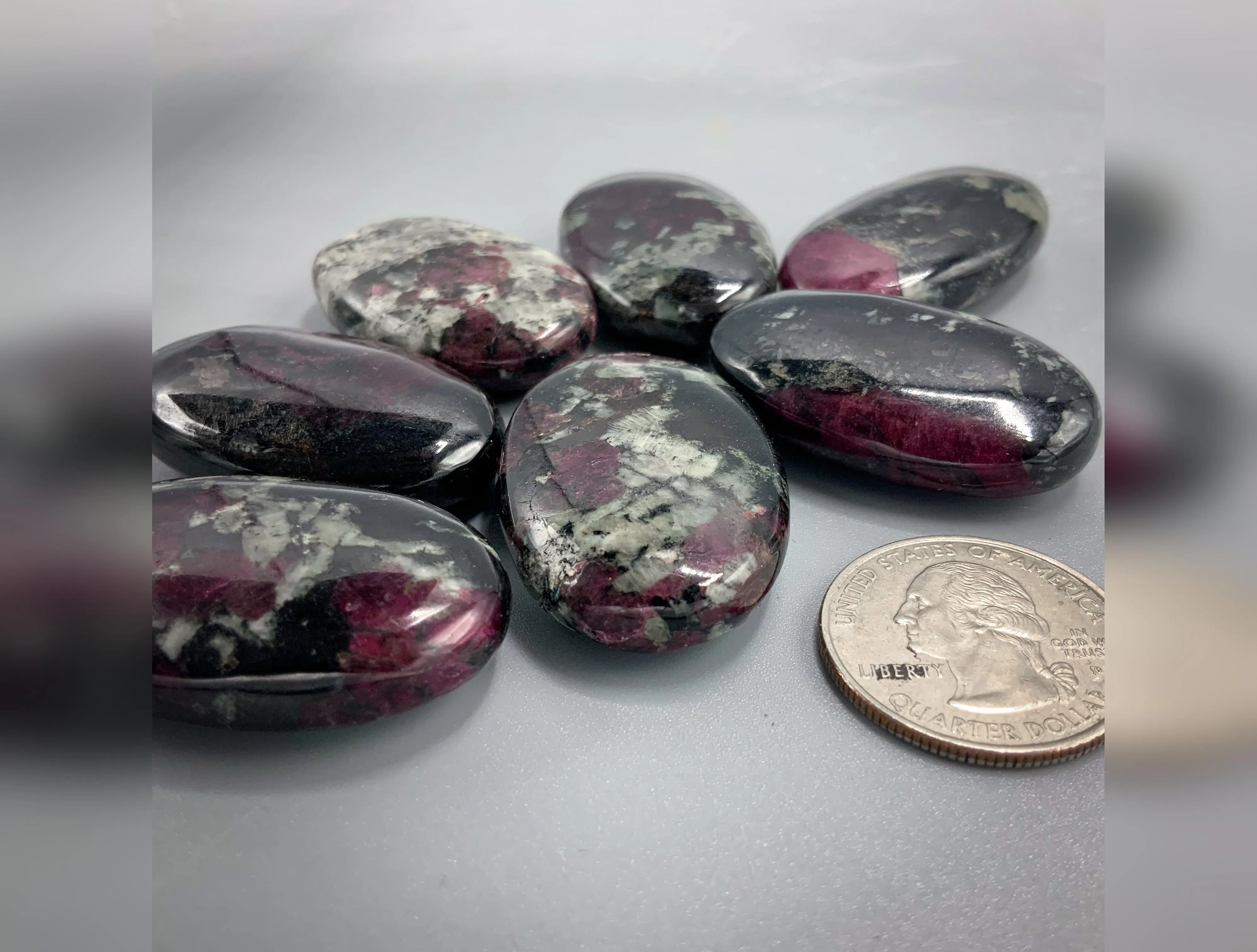 Eudialyte palm stones is said to be used in self-healing for repairing the emotional body and bringing in more vitality and life force. The black tourmaline inclusions in eudialyte purify energy and provides psychic protection. A great stone to pair with Ruby.