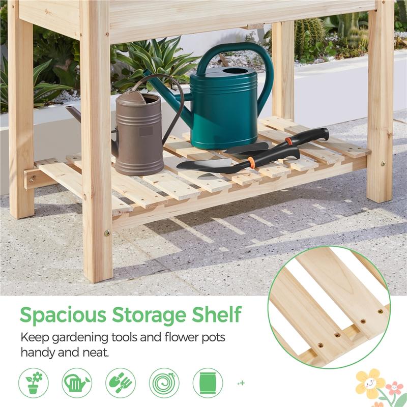 2. Versatile 2-Tier Design: The two-level structure includes a top planting box for vegetables, flowers, or herbs, and a bottom shelf for storing gardening tools, keeping everything within easy reach.