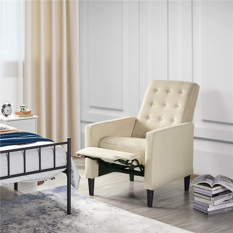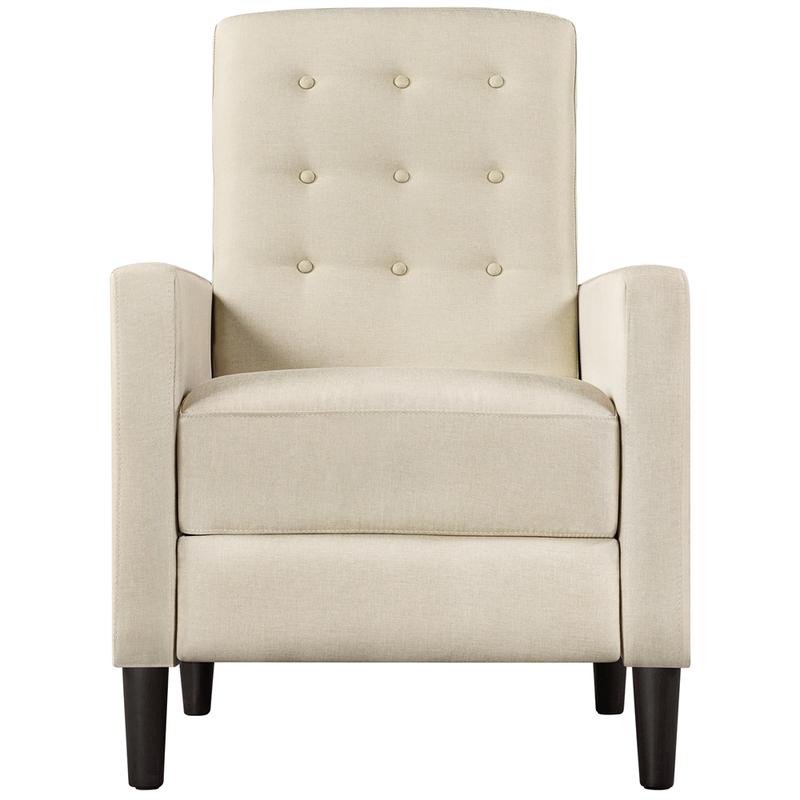 Elevate your bedroom or living room with a streamlined mid-century modern fabric recliner. Crafted with four tapered legs, it features a sturdy wooden frame, foam cushioning and solid-hued polyester upholstery—durable and easy to clean. Button-tufted detailing on the back adds subtle texture, and its neutral tone complements any home decor scheme. A fully reclinable back and pop-up footrest let you kick back and unwind with a movie after a long workday.