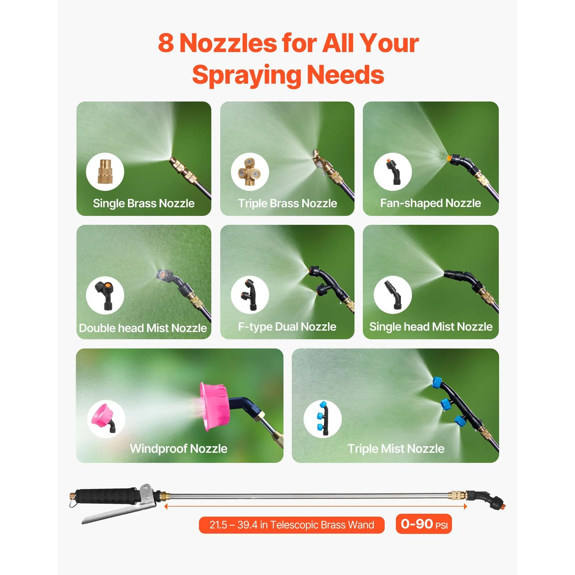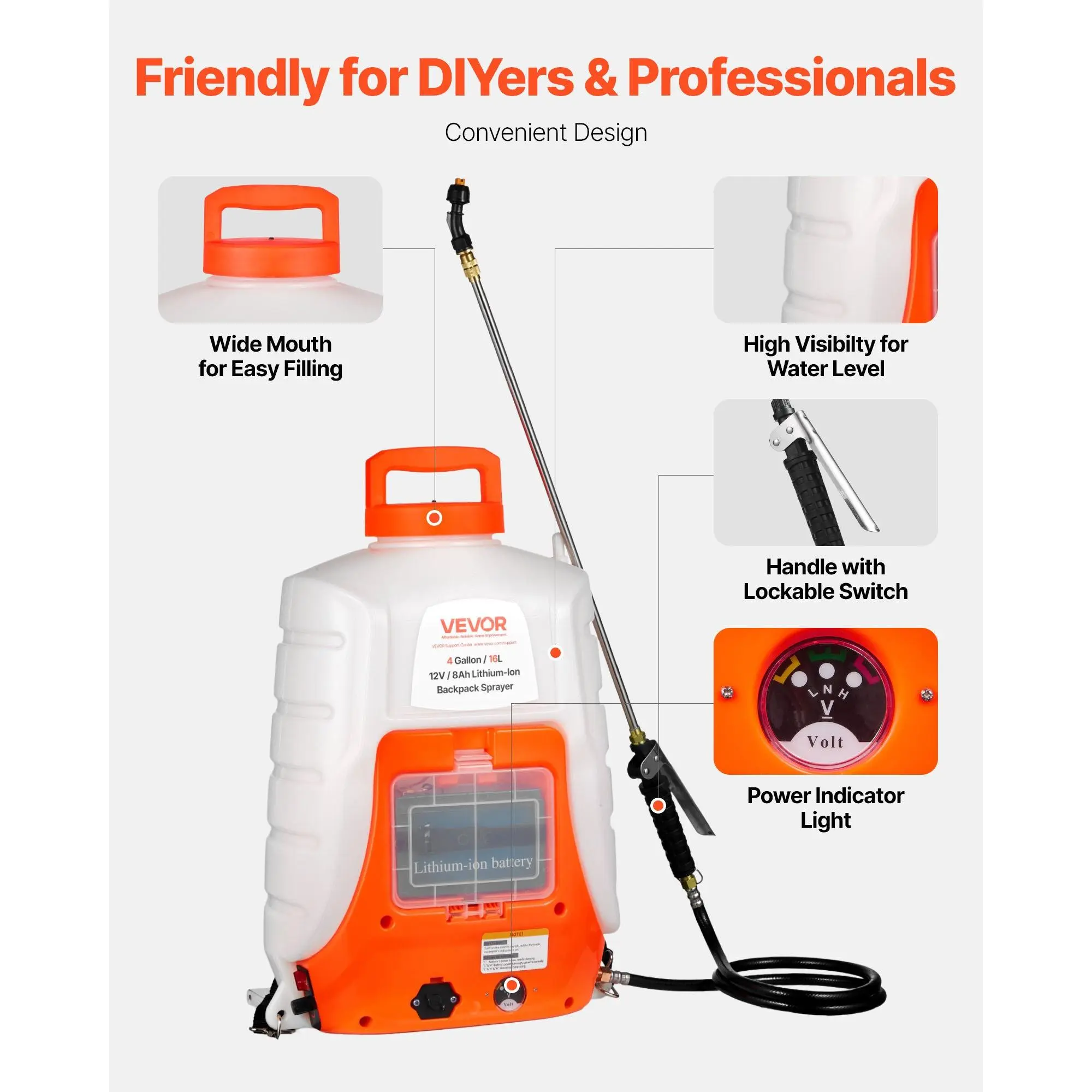 No More Hand Pumping: Spraying has never been easier!VEVOR's battery-powered sprayer features a durable 8Ah lithium-ion battery, which can spray for 4-6 hours straight from just one charge.The max.90 psi pressure of the pump allows the flow rate to reach up to 4.1L/min.The 4 Gal/15 L capacity is large enough to meet your daily needs, saving you labor and time.Time to spray your worries away!Multiple Nozzles Available: Our battery powered sprayer comes with 8 nozzles and 2 wands, giving you more options to choose how you spray!The metal wand features an adjustable length of 21.5"-39.4", and the plastic wand is suitable for bleaching agents and other corrosive liquids.The water pressure can be easily adjusted from 0 to 90 psi via the knob.Our sprayer will meet your various spraying needs with no trouble.Comfortable Shoulder Strap: The battery backpack sprayer features a shoulder strap for maximum comfort and portability.The widened straps and the cushion added to the back improve the softness and comfort.So you don't have to bear fatigue and soreness after long-time work.Get ready to work smarter, not harder.User-friendly Designs: Every detail is designed for your convenient use.The enlarged water inlet with a filter screen helps you add liquid easier, and the translucent tank with gallon markers lets you know the inner capacity clearly.Besides, the handle features a grommet, making it lockable to spray continuously without fatigue.What more could you ask for?Handle Any Spraying Tasks: Our electric backpack sprayer is ideal for indoor and outdoor spraying needs like watering, gardening, general cleaning, washing, pet bathing, disinfecting, and many other applications. Hooray, it's time to spray. Are you ready?VEVOR Battery Powered Backpack Sprayer, 0-90 PSI Adjustable Pressure, 4 Gallon Tank, Back Pack Sprayer with 8 Nozzles and 2 Wands, 12V 8Ah Battery, Wide Mouth Lid for Weeding, Spraying, Cleaning