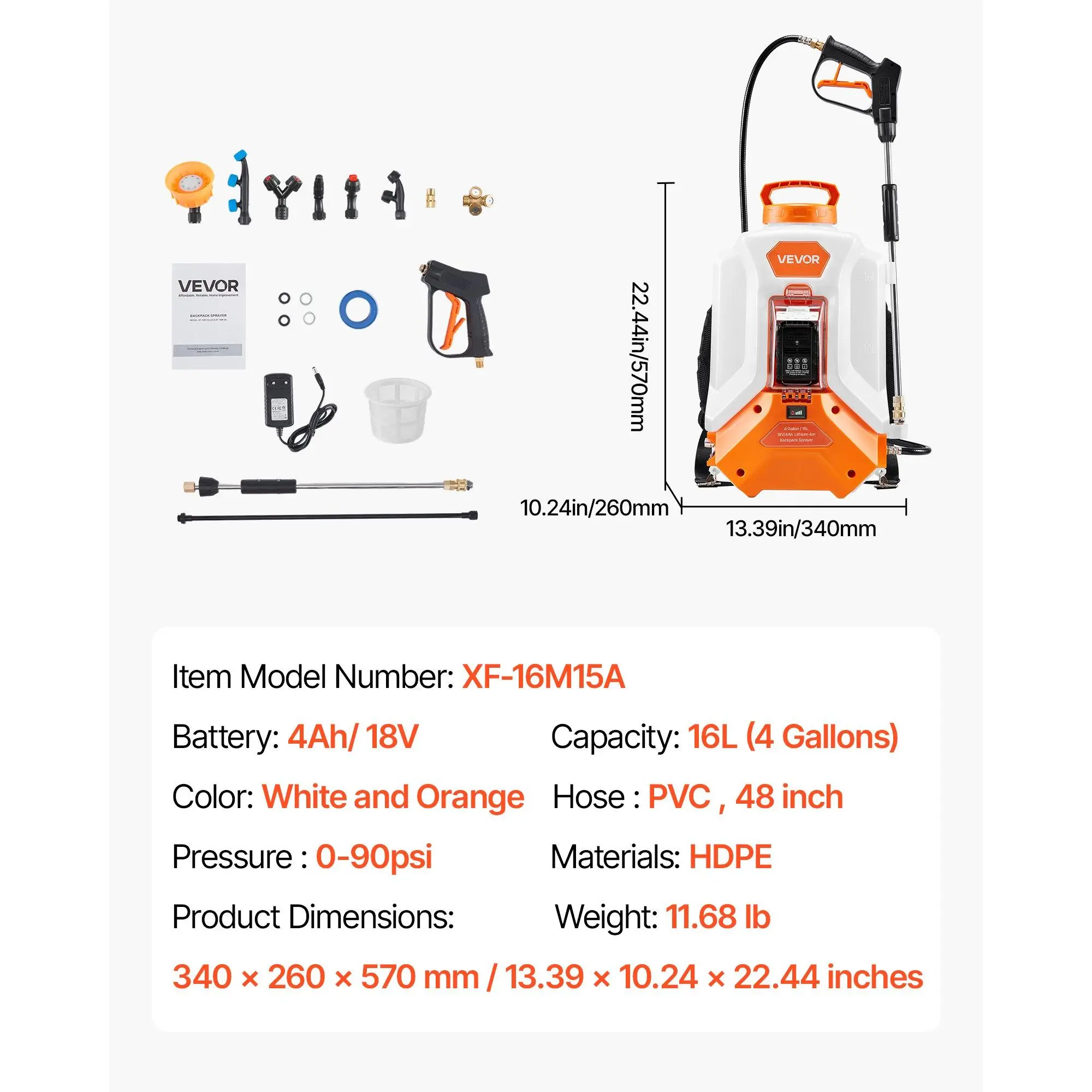 Flow Rate: 3. 3±0. 3 L/Min,Hose Parameters: PVC Mesh Hose, 1. 2m in length,Main Materials: HDPE (High-Density Polyethylene) Tank, PP, Fiberglass Spray Rod, Stainless Steel Spray Rod, Brass Nozzles, Plastic Nozzles,Capacity: 16L (4 Gallons),Working Voltage: DC 18V,Color: White + Orange,Voltage & Current: 14-21V DC / Max 1. 6A,Item Model Number: XF-16M15A-US,Product Weight: 5. 3 kg / 11.. 68 lbs,Pump Output Pressure Range: 0-90psi, Stepless Adjustable,Power Consumption: 28W,Product Dimensions: 340 * 260 * 570 mm / 13. 39 * 10. 24 * 22. 44 inches