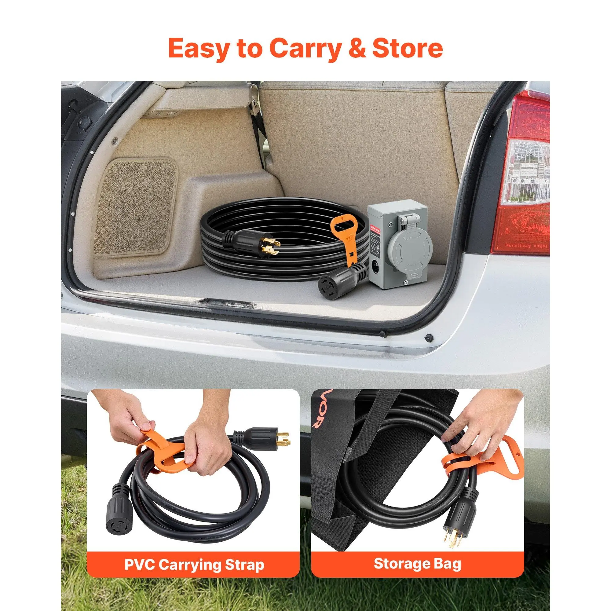 Premium 30A 15 ft Set: Built with SJTW 10AWG/4C heavy-duty cable, our generator cord supports up to 30A/7500W.Equipped with a NEMA L14-30P male plug, NEMA L14-30R female receptacle, and power inlet box-ideal for home backup and RV emergency powerDurable Copper Cable: Featuring pure copper core, our 15 ft generator extension cord delivers steady power transmission with minimal loss.With a flame-retardant PVC jacket, it resists bending, rain, snow, and extreme temperatures for long-term outdoor useWeatherproof Inlet Box: Designed with a flip cover and rust-resistant coating, our power inlet box shields against wind and rain.The LED indicator automatically lights up when powered, allowing you to easily check the power status even at nightHassle-Free Installation: With pre-drilled holes and detachable knockouts, no drilling or extra tools are needed.With a spacious interior, our generator cord and power inlet box allow smooth wiring, saving you both time and effortConvenient Storage: Comes with a storage bag and PVC carrying strap, allowing you to neatly store the generator extension cord and power inlet box.Compact design saves space in your RV or home while keeping your setup organizedVEVOR 30 Amp Generator Cord and Power Inlet Box, 15 FT, 125/250V NEMA L14-30P to L14-30R Heavy Duty Extension Power Cord, SJTW 10 Gauge 7500W, Pre-Drilled Inlet Box, for Generator to House, ETL Listed