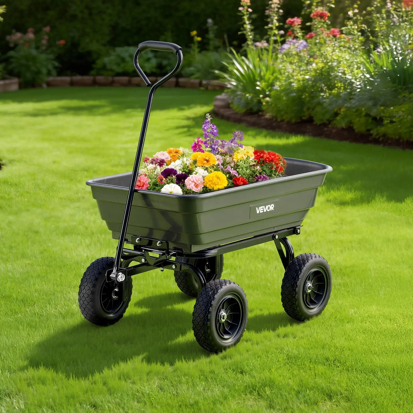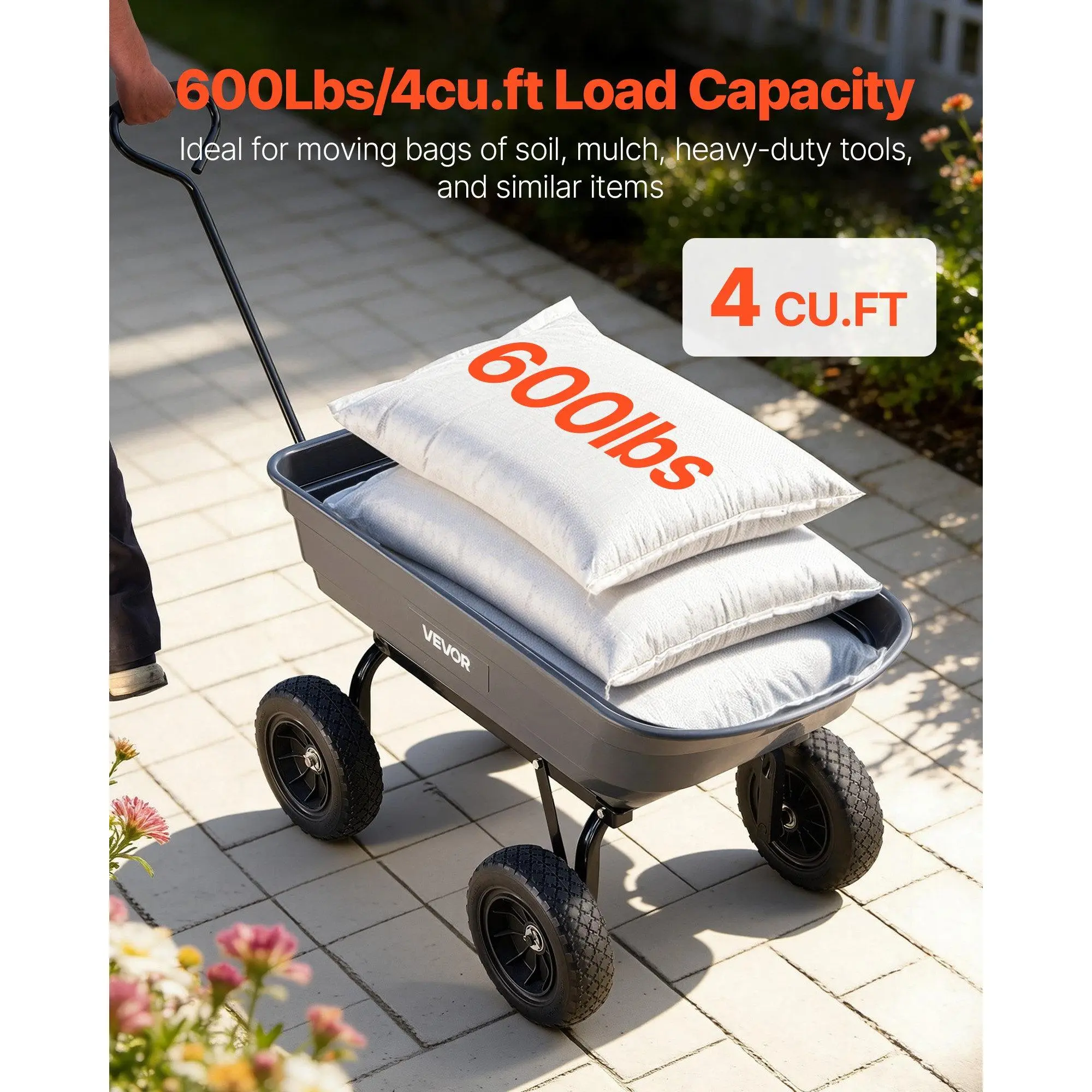 Quick Lift Dump: Built with a quick-tilt design, our lawn cart drops material the moment you lift the tray, allowing wet soil, leaves, and debris to glide out easily.It reduces effort across yard or farm work so you can move through tasks with steady, efficient flowSmooth Terrain Rolling: Equipped with 10"/254mm PU blowout-free wheels, this garden wagon clearance handles grass, mud, and gravel with steady flow.Its PP tray and rust-treated frame stay durable through changing outdoor use, offering reliable motion for ongoing yard or field workHigh Capacity Strength: Our yard cart and wagon holds up to 600lbs/272kg of soil, firewood, gravel, or crops.It carries more in one trip, cutting repeat hauls and giving smoother yard or farm workflow with steady handling across daily tasksSmooth Turning Support: With a 90° rotating handle and 180° wheels, this garden dump cart wagon stays easy to guide when filled, letting you turn, back out, or shift through narrow paths with less strainLight Tray Handling: Built with a PP tray, this VEVOR gardening wagon stays light and manageable, offering smoother control than metal options and steady outdoor durability.Dirt, grass, and fertilizer wash off with a quick rinse, reducing effort and making routine care more relaxedVEVOR Garden Dump Cart, 600 lbs Poly Dump Cart, Garden Carts Dumps Wagon with 90 ° Quick-Dumps Mechanism, 180 ° Swivel Wheels, 270 ° Flexible Rotating Bearings, Yard Wagon for Plants, Soil, Crops