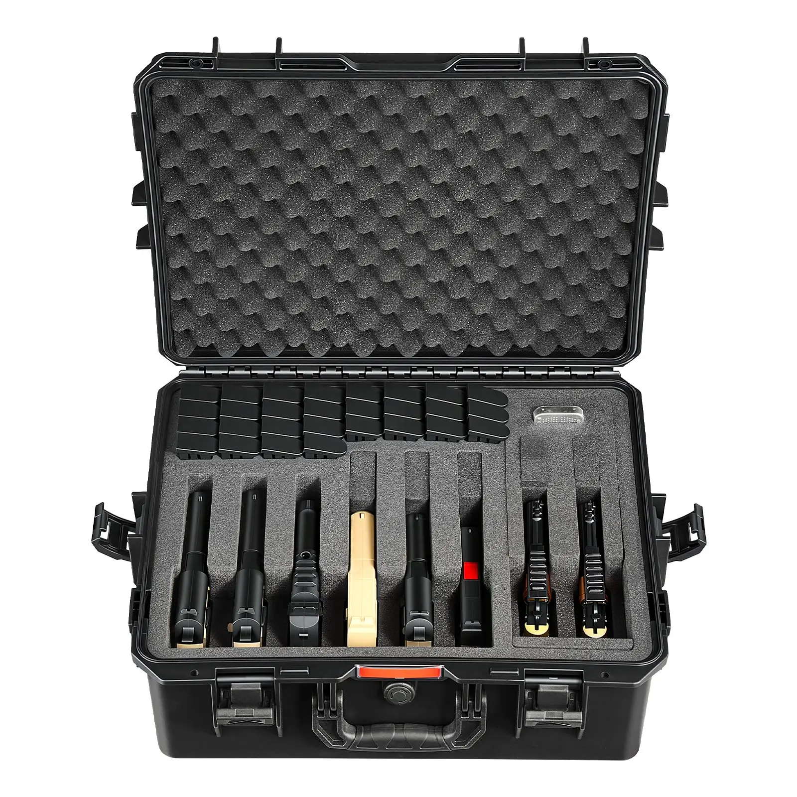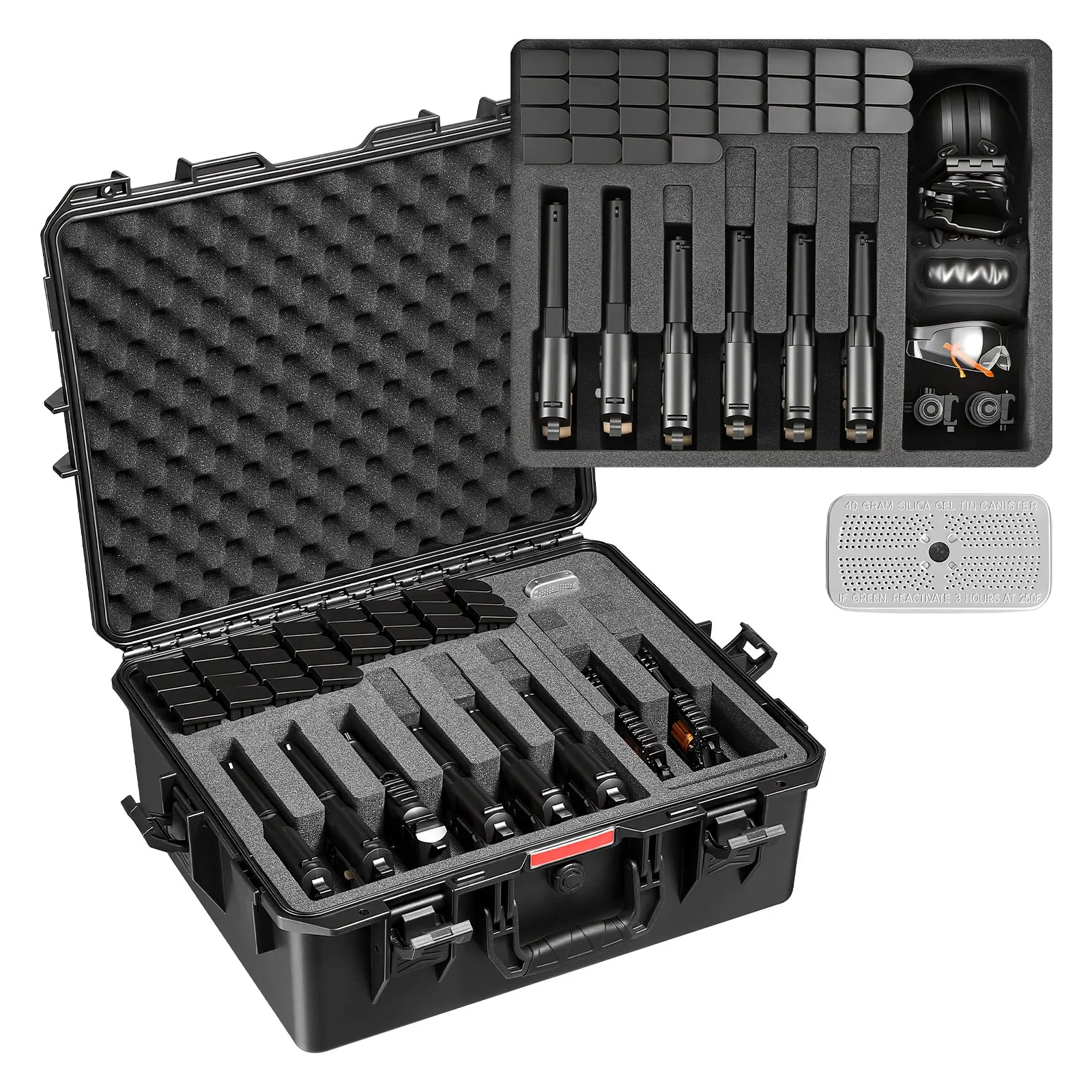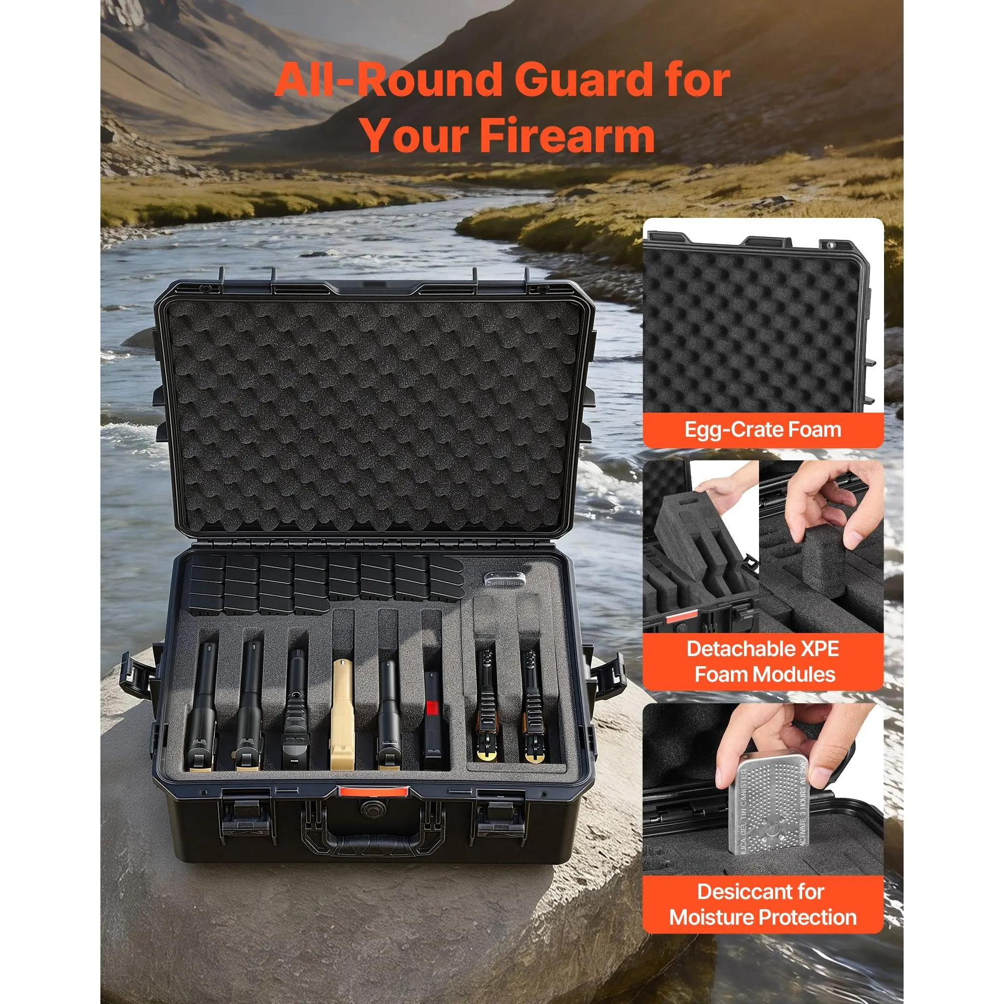 Firearm Protection: The hard pistol case holds up to 8 pistols and 28 magazines, fitting most handguns under 10.03 in / 254.76 mm including popular Glock models (suitable for revolvers).Ideal for the range, travel, or secure home storageCustomizable Modular: The hard gun case features detachable XPE modules for flexible storage.Expandable modules hold cleaning kits, timers, gloves, earmuffs and safety glasses.XPE modules with top egg-crate foam provide double protection and easy accessIP67 Waterproof & Dustproof: Our pistol case is made of impact-resistant PP.IP67 sealed design protects against rain, mud, sand, and dust.Internal desiccant keeps firearms dry, avoiding rust and ensuring long-lasting protection during storage and transportTSA Compliant: The rifle case is TSA tested for travel on planes, trains, and public transport.Four latches ensure secure closure, and two lock holes allow adding padlocks for extra firearm safety during transport (padlocks not included)Durability and Longevity: This pistol gun case boasts metal hinges for greater wear resistance and long-term use. The included pressure-equalizing valve helps adjust air pressure during transport, keeping firearms secure and in good conditionVEVOR Hard Pistol Case, Heavy Duty Hard Gun Case with XPE Foam Lining, Waterproof Pistol Storage Box with Customizable Interior & Handle for Gun, Lenses, Camera, Gear, TSA Compliant, 21.9x17.9x8.8 in
