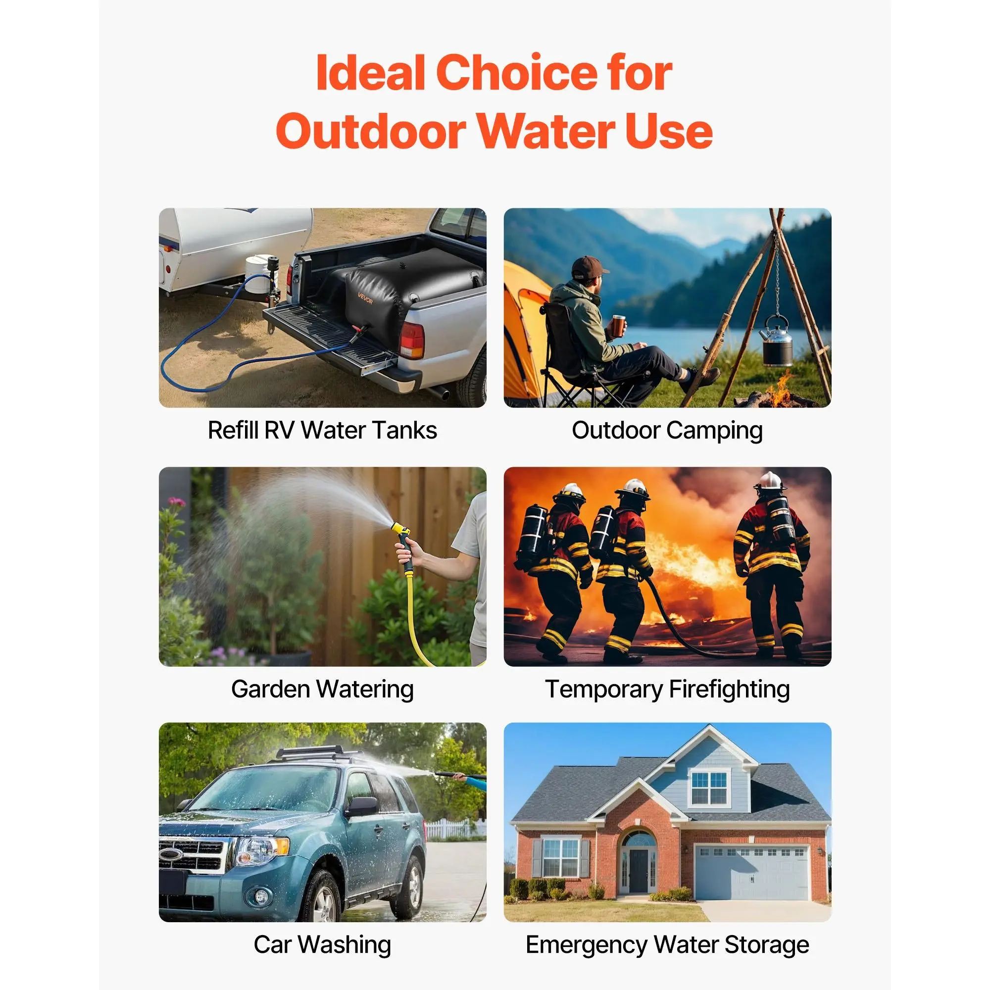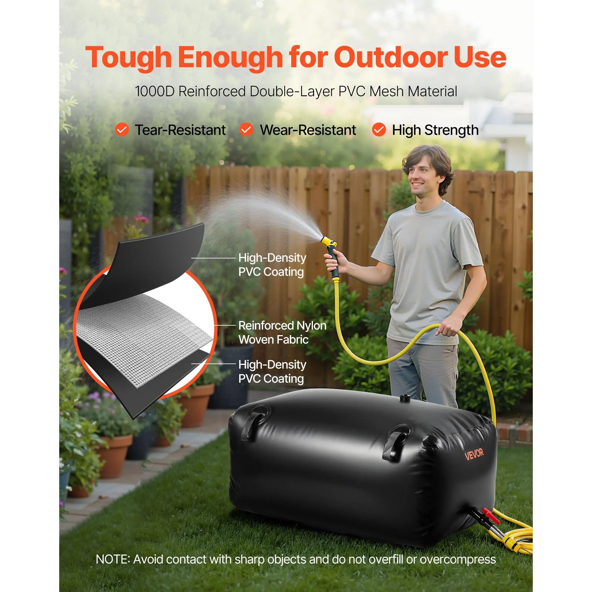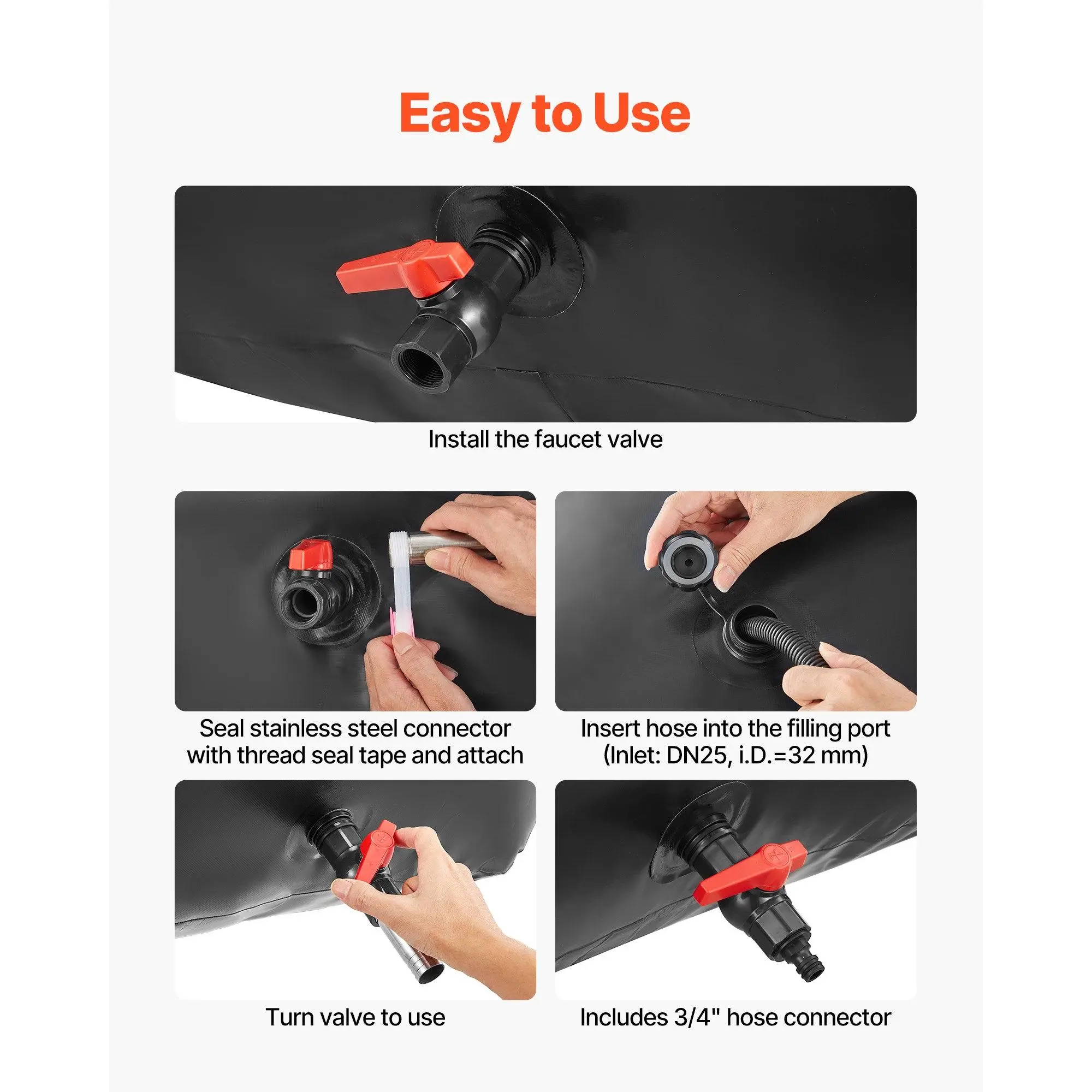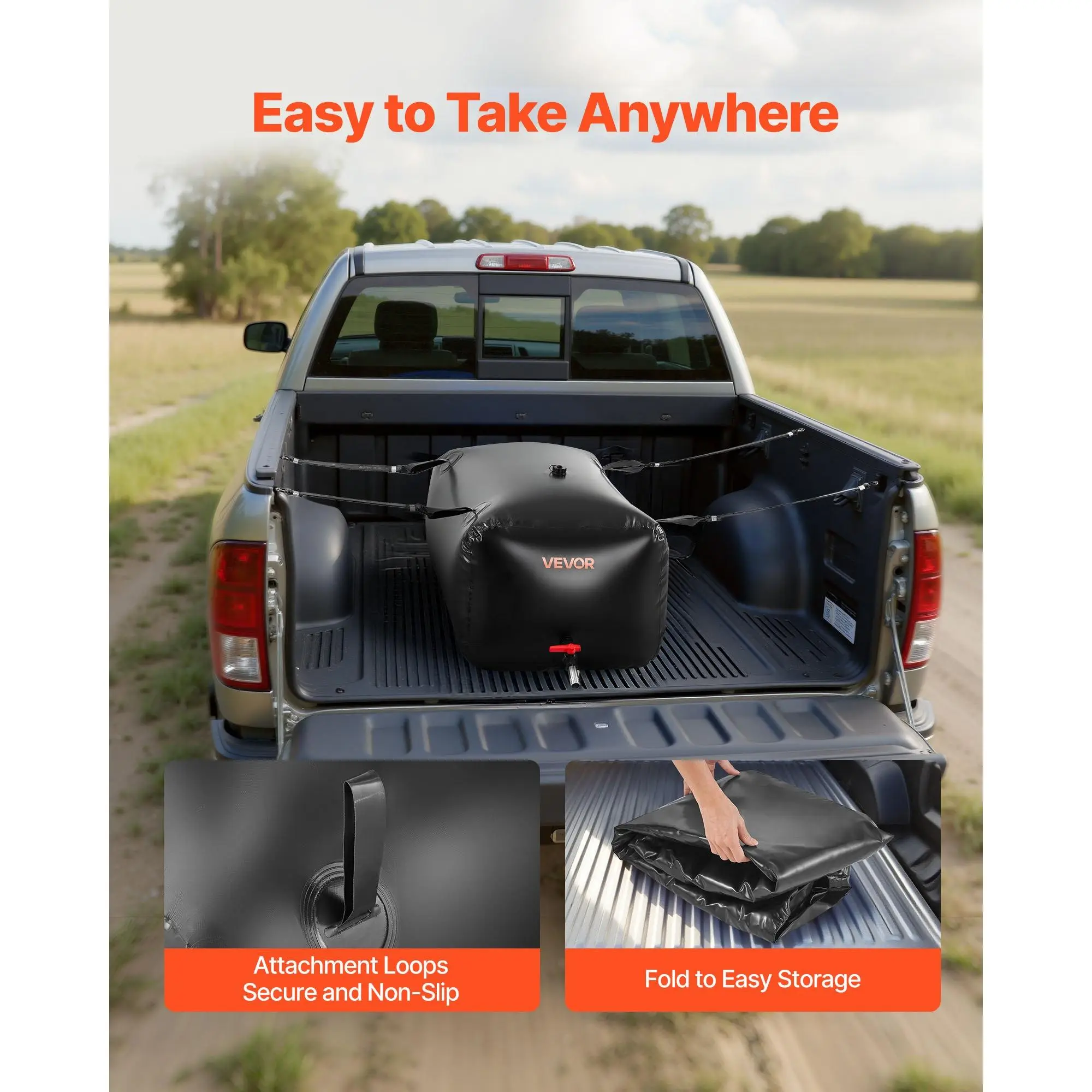 63.4 Gal Water Storage Bag: Our PVC water storage bag measures 39.8 x 23.6 x 17.7 in, holding up to 240 L / 63.4 Gal-ideal for irrigation, RV water supply, or emergency water storage.Comes with a complete accessory kit and repair kit for easy use1000D Double-Layer PVC: Made with thick double-layer 1000D fabric with PVC coating, reinforced with tear- and wear-resistant mesh inner layer, this water storage bladder withstand temperatures from 5°F to 167°F. This structure reduces aging and extend the bag's lifespanUpgraded Sealing: High-temperature heat-sealing strengthens double-layer PVC seams.The double heat-fused ports resist tearing and enhance pressure resistance.Pre-installed sealing rings at the outlet (plus an extra replacement ring) and sealing tape included ensure a stable, leak-free connection to faucet/connectorEasy to Use: The collapsible water storage bladder bag comes with pre-installed inlet (DN25, 32mm male thread) and outlet (DN20, 25mm male thread) fittings.Simply attach the faucet at the outlet and connect a garden hose to fill.Ready to use in minutesPortable & Easy to Store: The portable water bladder comes with four reinforced carry loops allow secure placement in pickup beds, SUVs, or on the roof for safe transport. Flexible PVC material folds flat for compact storage when not in use, eliminating the need for bulky water tanksVEVOR Water Storage Bladder, 63.4 Gal Collapsible Water Storage Bag, Wear-Resistant 1000D PVC Soft Waters Bag, Leakproof Camping Tank Containers for Garden Irrigation RV Emergency Use, Black