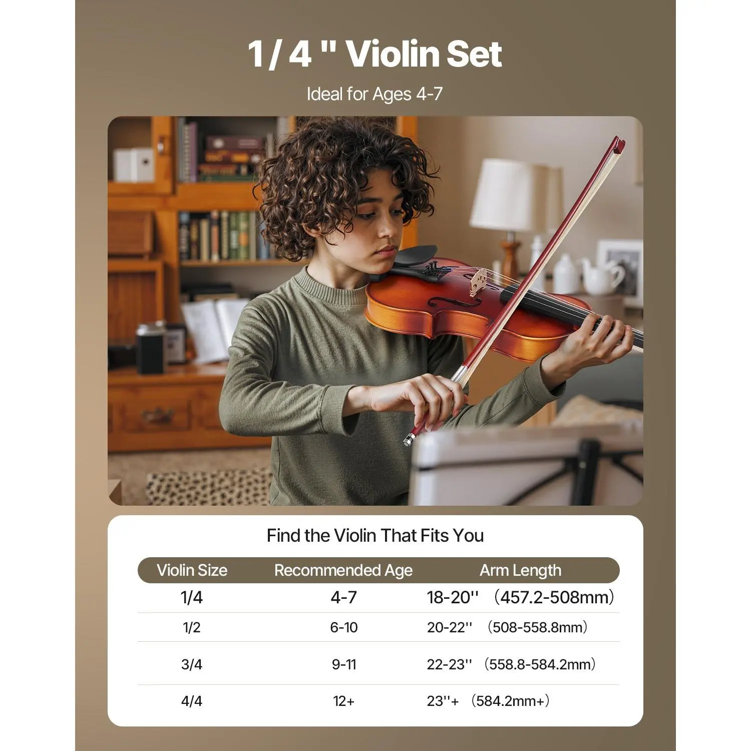 Fully Handcrafted from Solid Wood: Made with a high-density spruce top to enhance sound resonance, making the tone clearer, brighter, and warmer.The maple back improves the structural stability while enriching the tone, providing better resonanceEasy Tuning: A tuner is included with the violin, featuring precise high detection to ensure every tuning session achieves the ideal pitch.Whether you’re a beginner or a professional performer, you'll easily master the tuning techniques and enhance your playing experience1/4 Violin: This size of violin is ideal for users aged 4-7 with an arm length of 18-20 inches (457.2-508 mm).It is a ideal violin instrument for beginners or performers and is great for lessons, performances, or home practiceComfortable Shoulder Rest: The shoulder rest design provides excellent support for the player’s shoulder, improving playing stability.Whether practicing for extended periods or performing, it helps you maintain the best posture for playingComplete Violin Set: Includes violin case, bow, bridge, rosin, tuner, shoulder rest, spare strings, sticker, and polishing cloth.No need for extra accessories-just open the package, tune, apply rosin, and start playing immediatelyVEVOR Violin 1/4 Size for Adults, Violin Fiddle Set for Beginners Student with Hard Case, Rosin, Bow, Shoulder Rest,Bridge,Tuner and Extra Strings,Solidwood Professional Musical Instruments (Brown)