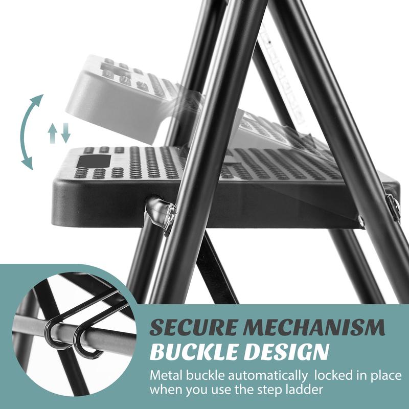 ·SECURITY AND STABILITY: High-grade steel frame is constructed with strength and reliability. Metal safe buckle automatically locked in place when you use the step ladder. The back cross brace structure reinforce the basic support