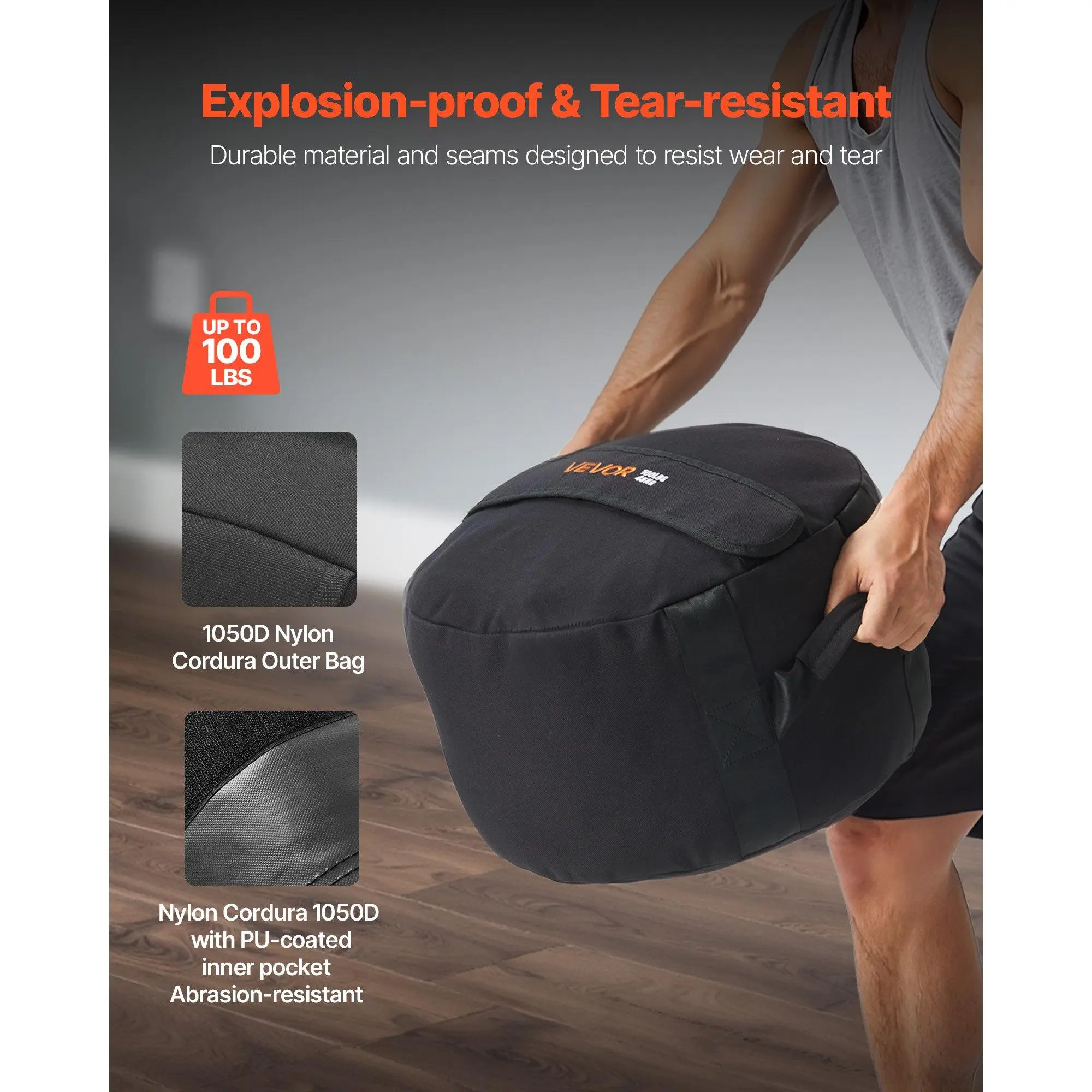 Durable & Tear-Resistant: Made with high-quality materials, this workout sandbag features an inner and outer bag crafted from nylon Cordura 1050D with a PU coating, ensuring durability and resistance to wear and tear.Ideal for heavy-duty trainingWaterproof & Sand-Proof: Our fitness sandbag is equipped with YKK zippers and hook-and-loop.The zipper is reinforced with triple stitching and an additional waterproof layer to securely retain sand, ensuring a clean and mess-free workout experienceFull-Body Training Tool: This sand bag for weight training includes a manual to guide you through weight training, muscle building, and physical conditioning.It targets shoulders, arms, chest, abs, legs, and overall strength for a complete workoutAdjustable Weight: Featuring a leak-proof filling bag, this adjustable sand bag allows you to adjust the weight up to 100 lbs, making it suitable for different fitness levels and training needs.Tailor the resistance for your workout goalsPortable & Easy to Store: This heavy-duty workout sandbag is easy to assemble and carry.Once folded, it fits conveniently into a training bag, making it suitable for use at home, in commercial gyms, outdoor workouts, or mobile training sessionsVEVOR Workout Sandbag, Heavy Duty Workout Power Bags with Handles, 100 lbs/45 kg Slam Bag for Fitness Strength Weight Training Cross-Training, Home Gym Exercise, Black (Unfilled)