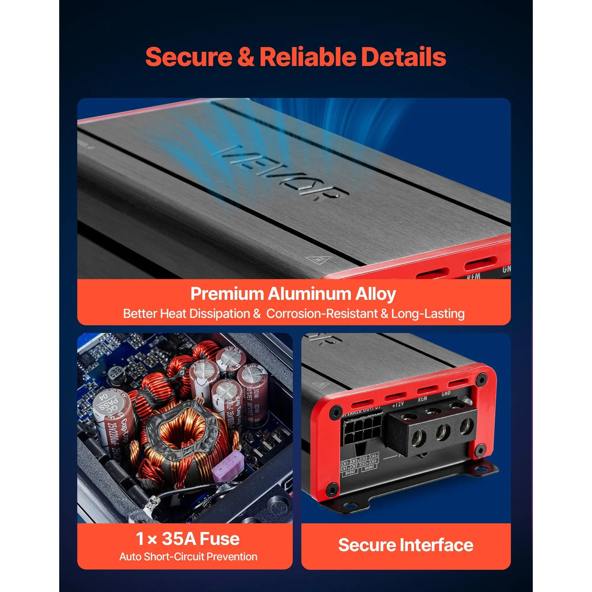 High Power, Strong Performance: This 4-channel Class D car audio amplifier delivers up to 4 x 120W @ 4 Ohms / 4 x 200W @ 2 Ohms (max) for clean, stable output even at high volume.Enjoy full and powerful in-car audioBridgeable for Extra Bass Power: Bridgeable channels give you the option to combine power output for subwoofers.This 4-channel car amplifier delivers deep, punchy bass without needing an additional amplifierCrystal-Clear Audio Quality: Featuring low distortion (THD 0.038%) and an SNR above 90 dB, this 4 channel amp delivers clean, accurate sound from deep bass to smooth jazz, with minimal unwanted noiseBetter Heat Dissipation: The car stereo amp's aluminum alloy shell quickly dissipates heat from internal components for cooler operation and longer lifespan.The built-in fuse ensures reliable current control for dependable operation under all conditionsWide Vehicle Compatibility: Built to integrate smoothly with sedans, SUVs, pickup trucks, off-road vehicles, and sports cars, this 4-channel amplifier works with nearly all 12V automotive systemsVEVOR 4 Channel Car Audio Amplifier 2 Ohm Stable Bridgeable Class D Full Range Amp Max Power 4 x 120W @ 4 Ohm / 4 x 200W @ 2 Ohm for Car SUV Truck Off-Road