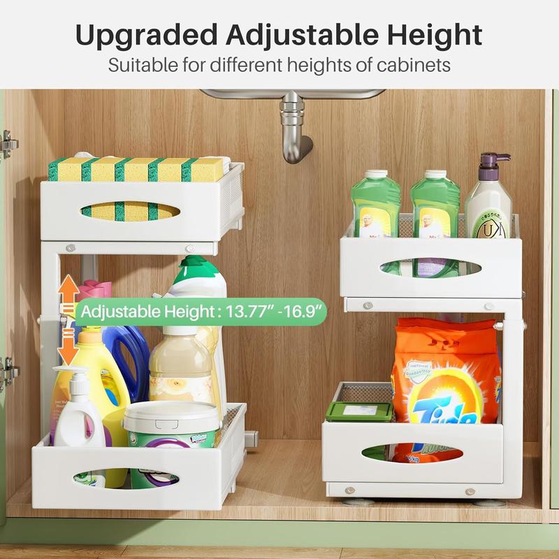 ·Designed with 3 adjustable height levels (13.7 inches to 16.9 inches) to fit different storage needs and cabinet sizes, flexible to adapt to various under-sink and cabinet spaces.