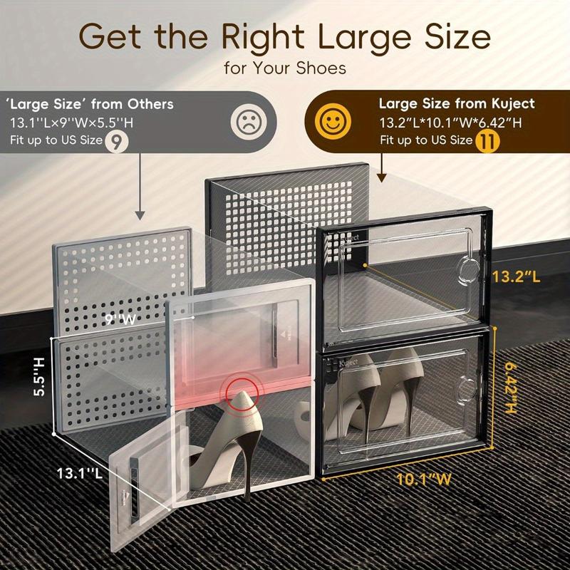 This set includes 6 pack larger shoe storage boxes, specially designed to fit men’s US size 11 (EU 45) sneakers, casual shoes, and low-top boots—no more struggling with small boxes that don’t fit your big shoes. The roomy interior keeps shoes in shape and protected from dust and scuffs.