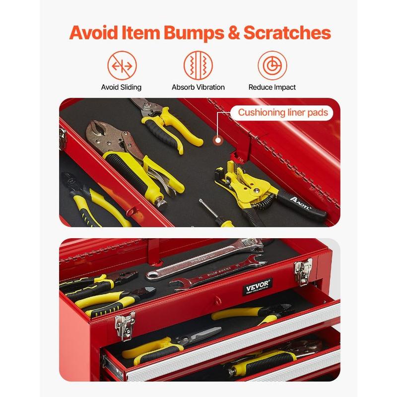 VEVOR Metal Tool Box, 20.5 - inch, Portable Metal Tool Box with 3 Drawers, Small Tool Chest with EVA Liners, Ball Bearing Slide Drawers Locking Powder Coated Finish, Multi - Function Tool Organizer, RedVEVOR Metal Tool Box, 20.5-inch, Portable Metal Tool Box with 3 Drawers, Small Tool Chest with EVA Liners, Ball Bearing Slide Drawers Locking & Powder Coated Finish, Multi-Function Tool Organizer, Red Ample Storage Space Auto-Locking Convenient Use Multi-functional Use Sturdy &