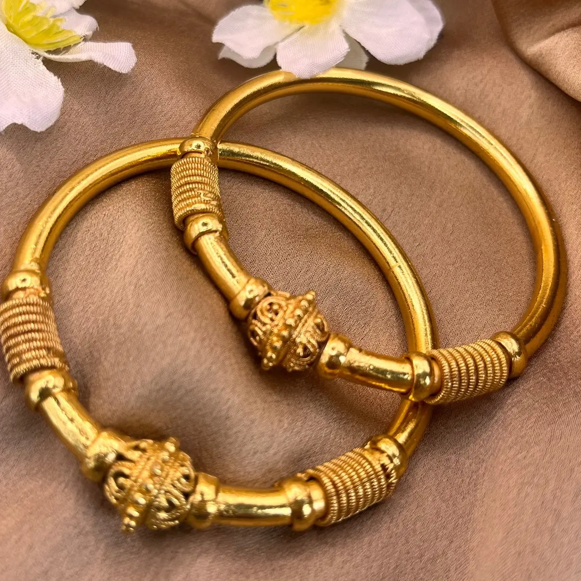 The 24k gold plated bangle set is a timeless and elegant set of 2 pieces that can add a touch of sophistication to any outfit. The set is made of 24k gold plated material, which is known for its durability and resistance to tarnishing. This ensures that the bangle set will last for a long time, even with frequent use.