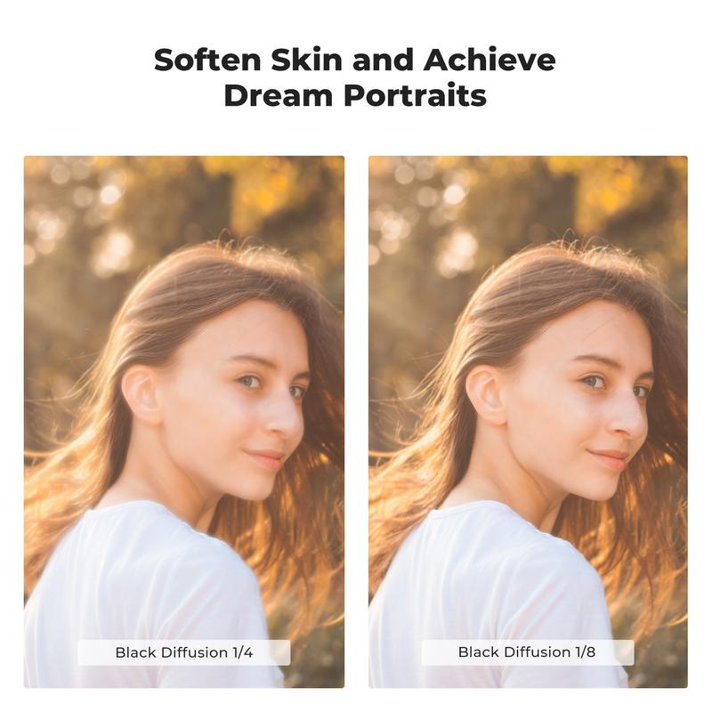·[Professional Portrait Photography Filter]The black diffusion mist filter can soften wrinkles and freckles of facial skin, making it more delicate and gorgeous, presenting a dreamy cinematic effect.Recommend using it in video shooting and portrait photography.