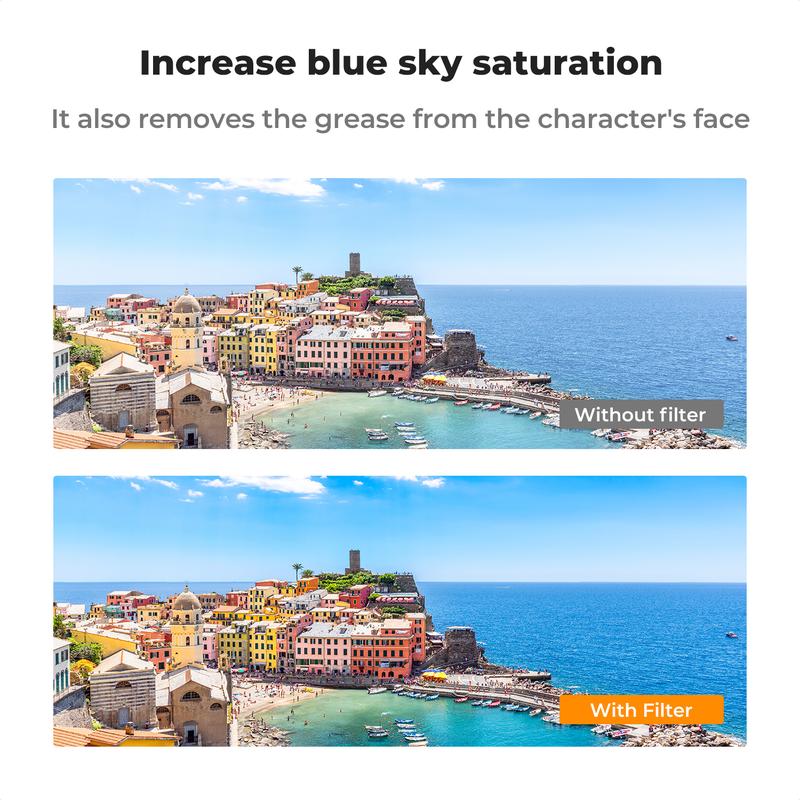 Enhance Color & ContrastCPL filter can enhance the color and contrast, and remove non-metallic reflections such as water, and glass to show the true color, especially used in white cloud and blue sky photography.