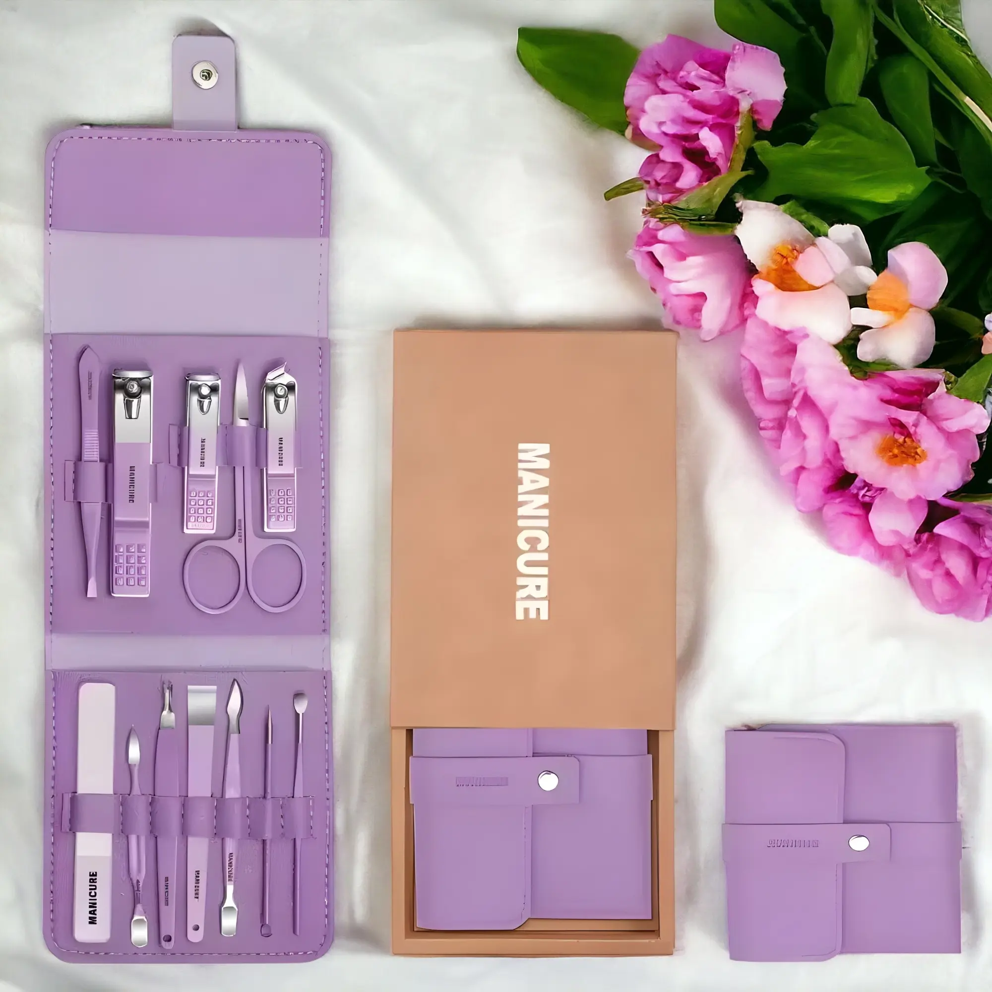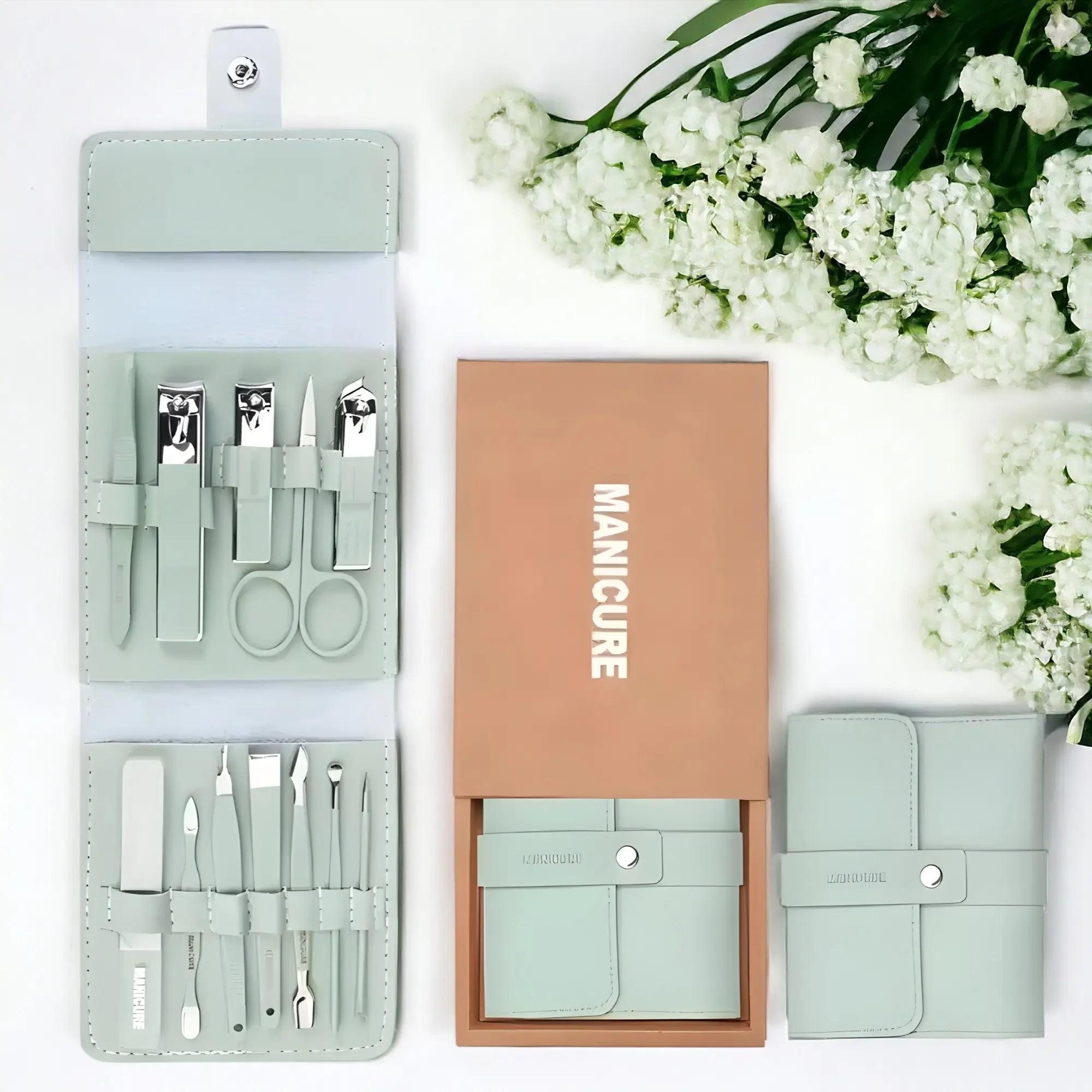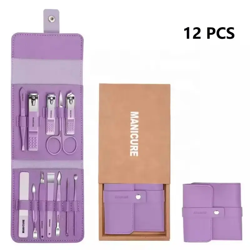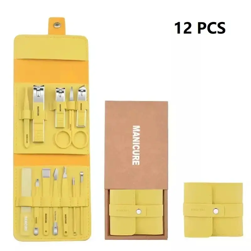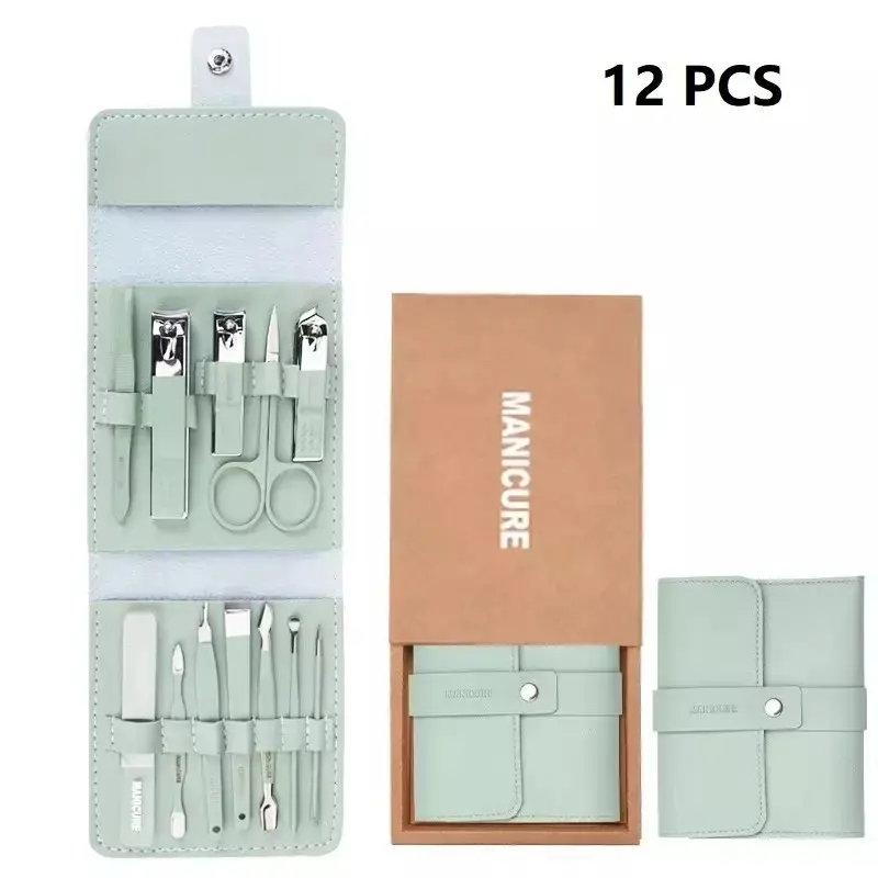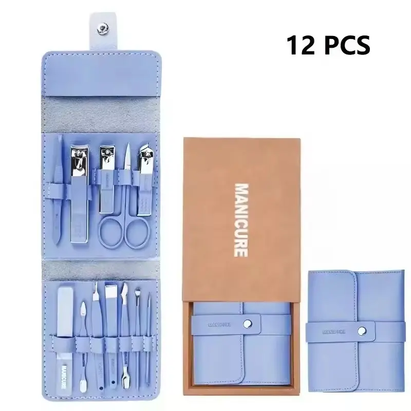 This comprehensive kit features 12 stainless steel grooming tools including scissors, nail clippers, cuticle remover, and more, catering to daily manicure and pedicure needs.