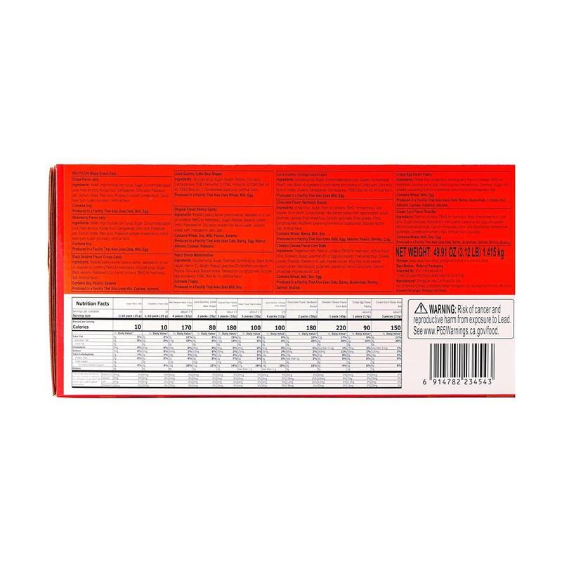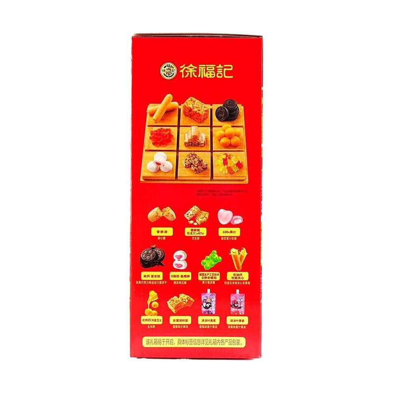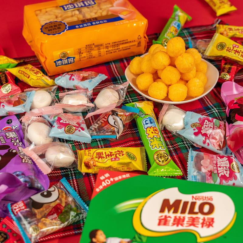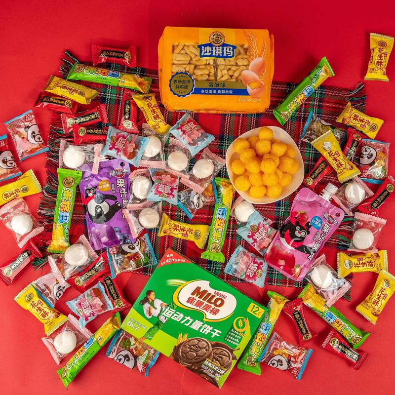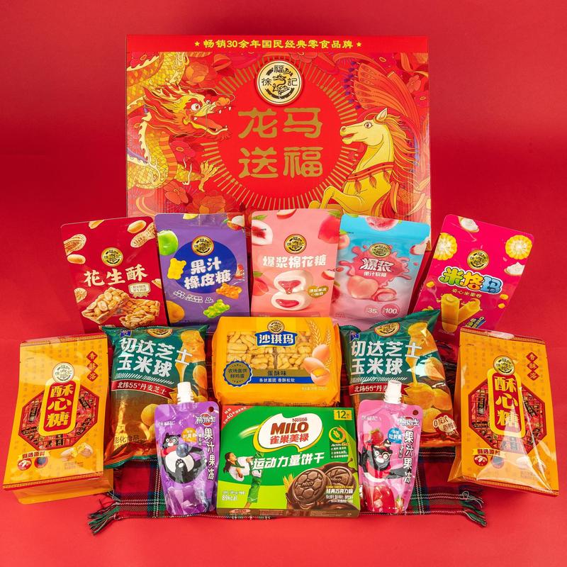 ·The gift box features a selection of popular best-selling items: Crispy Candy, Fruit Juice Gummy Strips, Rice Cracker Rolls, Bursting Marshmallows, Cheese Corn Puffs, Sachima, Milo Biscuits, Fruit Juice Jelly, Peanut Crisp.