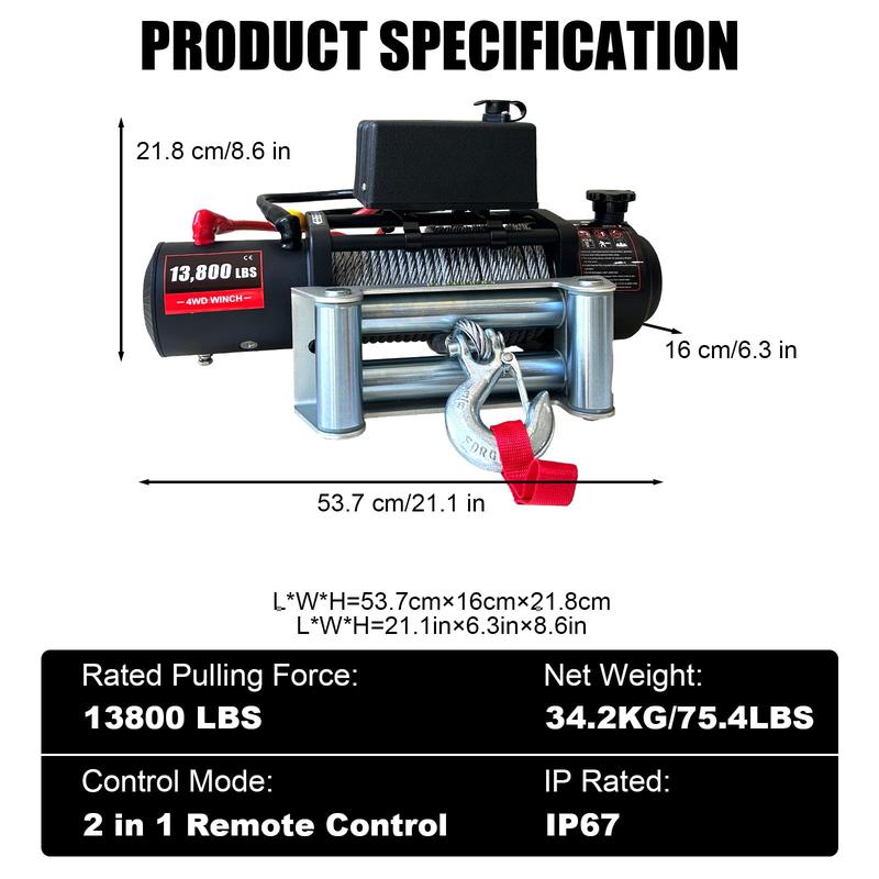 · 13,800 lbs Pulling Force & IP67 Waterproof: Designed for heavy-duty HVAC and pipeline tasks, this 12V electric winch features robust black powder coating, stainless steel hardware, and an IP67 waterproof rating for optimal durability in harsh work environments.