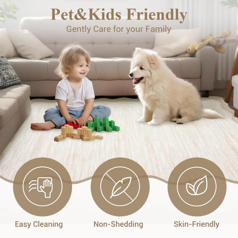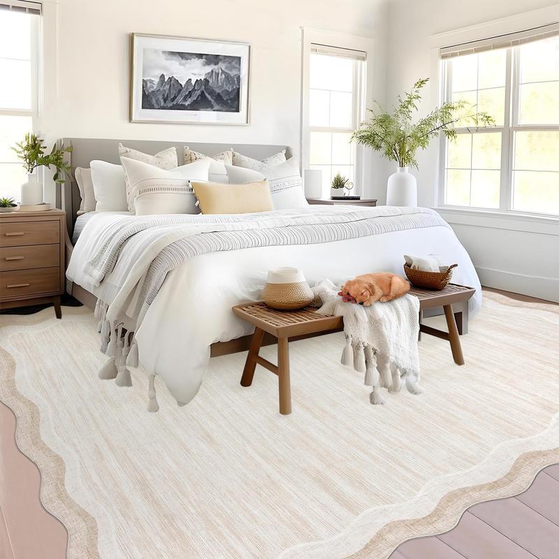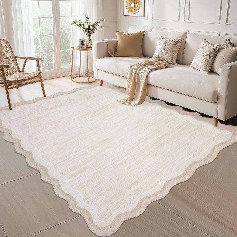 · 【Trendy Scalloped Edge Design】: The area rug features a popular scalloped border that adds a playful, modern touch to any space—no boring straight edges here! The clean, solid color appearance is appropriate for various decoration styles, and the unique wave contour distinguishes it from ordinary carpets, making it a perfect combination of trendy design and daily practicality.