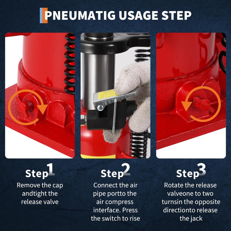 · 【Dual Power Lifting System】Two removable handles easily switch between pneumatic hydraulic mode and manual pumping mode. The portable handle ensures reliable operation anywhere, suitable for heavy-duty work, truck repair, tire changing or roadside emergencies that require speed or flexibility.