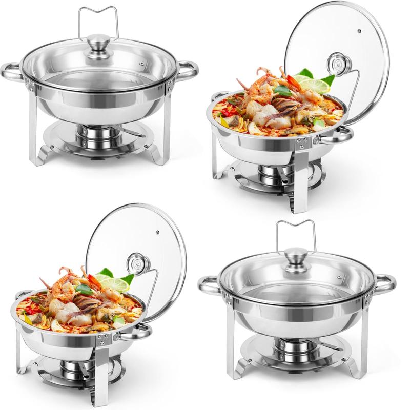 · Complete Set for Every Occasion: Each set includes 4 chafing warmers, featuring a glass lid, stainless steel lid holder, frame, food pan, water tray, pan holder, and fuel can. This buffet chafer set ensures that your food will be elegantly presented to your guests, allowing them to enjoy a delightful dining experience.