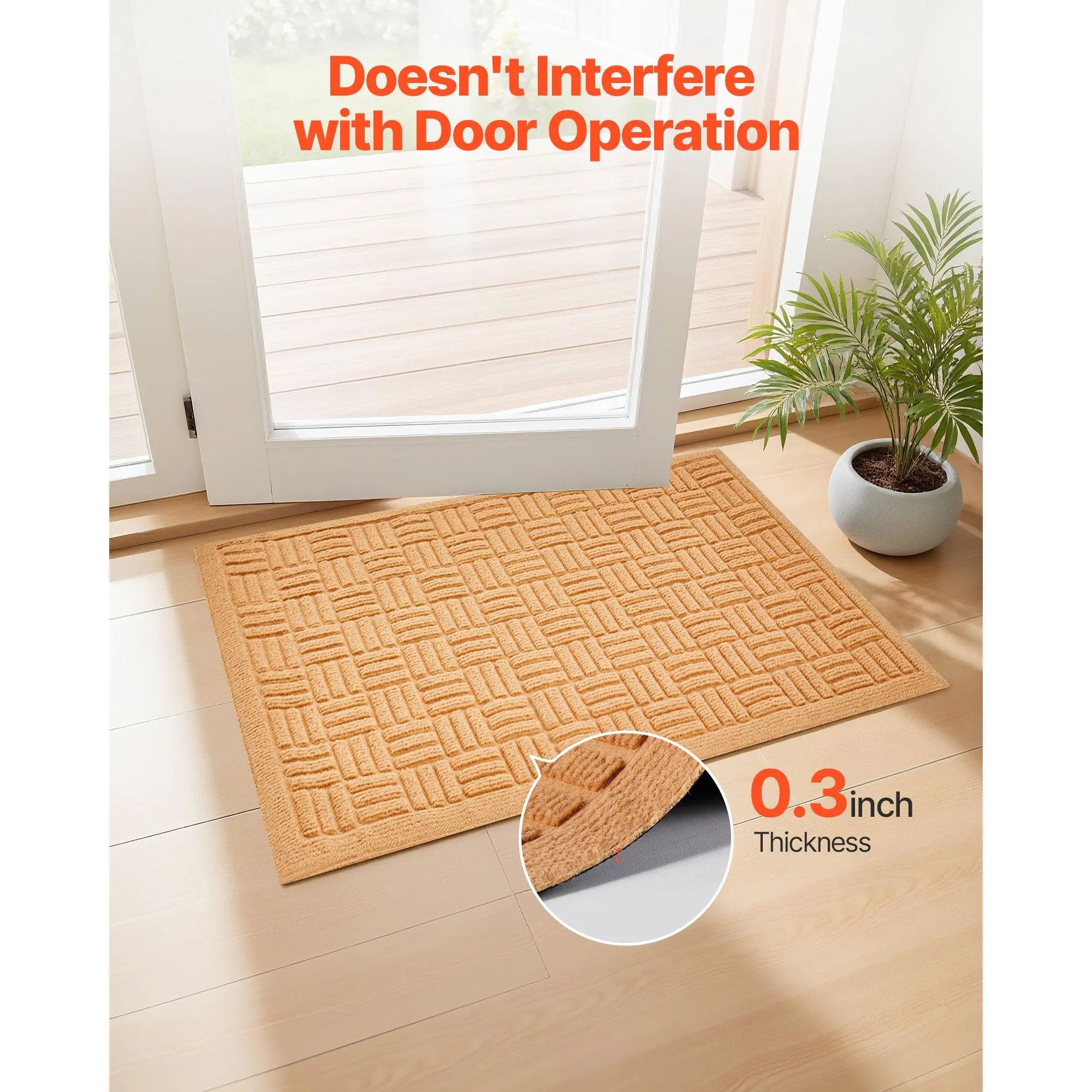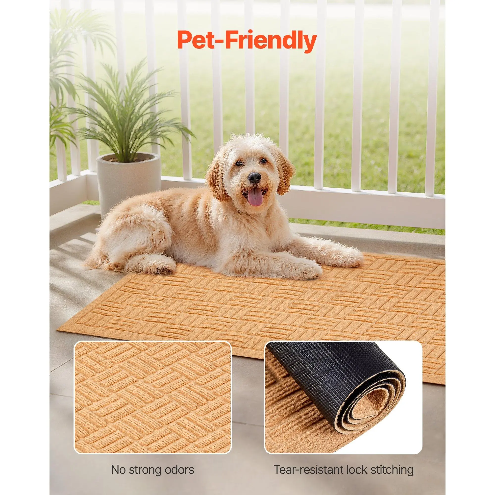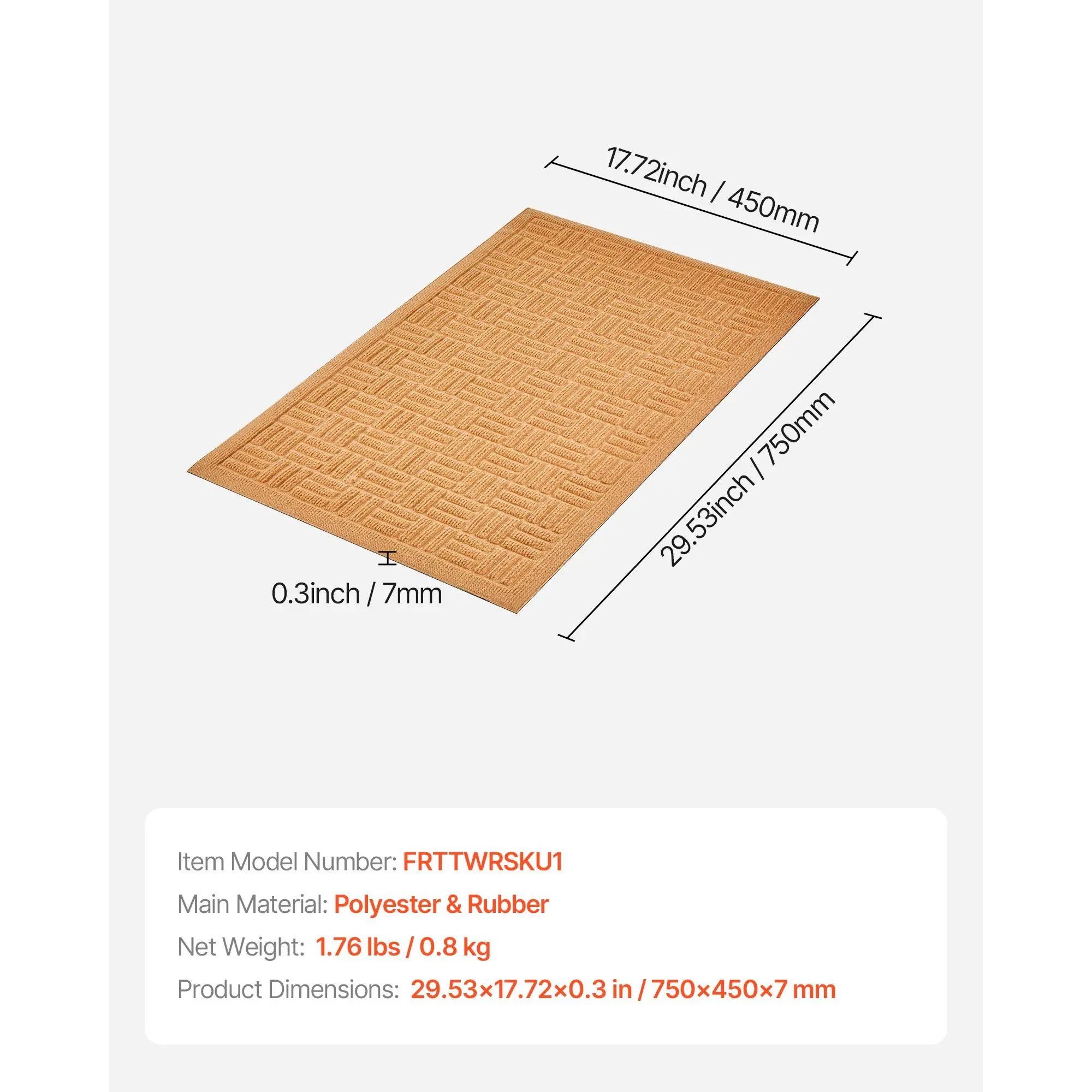 Absorbs Dirt & Water: This door mat features dense polyester fibers and a textured design that absorbs dampness and dirt from shoes, boots, and pet paws, keeping your home fresh and dryNon-Slip & Durable: The rubber backing of the welcome mat grips the floor securely, avoiding slips on tile, wood, and marble.Clean the surface before placing it for maximum security and stabilityPet-Friendly: Reinforced edges resist pet claws, avoiding rips and tears.This front door mat’s design makes it an excellent choice for homes with pets, offering a secure, durable surface for your furry friendsLow-Profile Design: At just 0.3 inches thick, this indoor door mat fits seamlessly under doors and won’t curl up, ideal for entryways, patios, kitchens, garages, and moreEasy to Clean: Vacuum or machine wash the outdoor door mat to easily remove dirt, dust, and moisture.It’s colorfast, durable, and built to last through repeated cleaningsVEVOR Door Mat, 29.53 x 17.72 Inch, Front Door Mat Outside Entrance with Non-slip Rubber Backing, Dirt-Resistant & Absorbent, Easy to Clean, Low-Profile Doormat for for Entryway, Patio, Porch, Beige