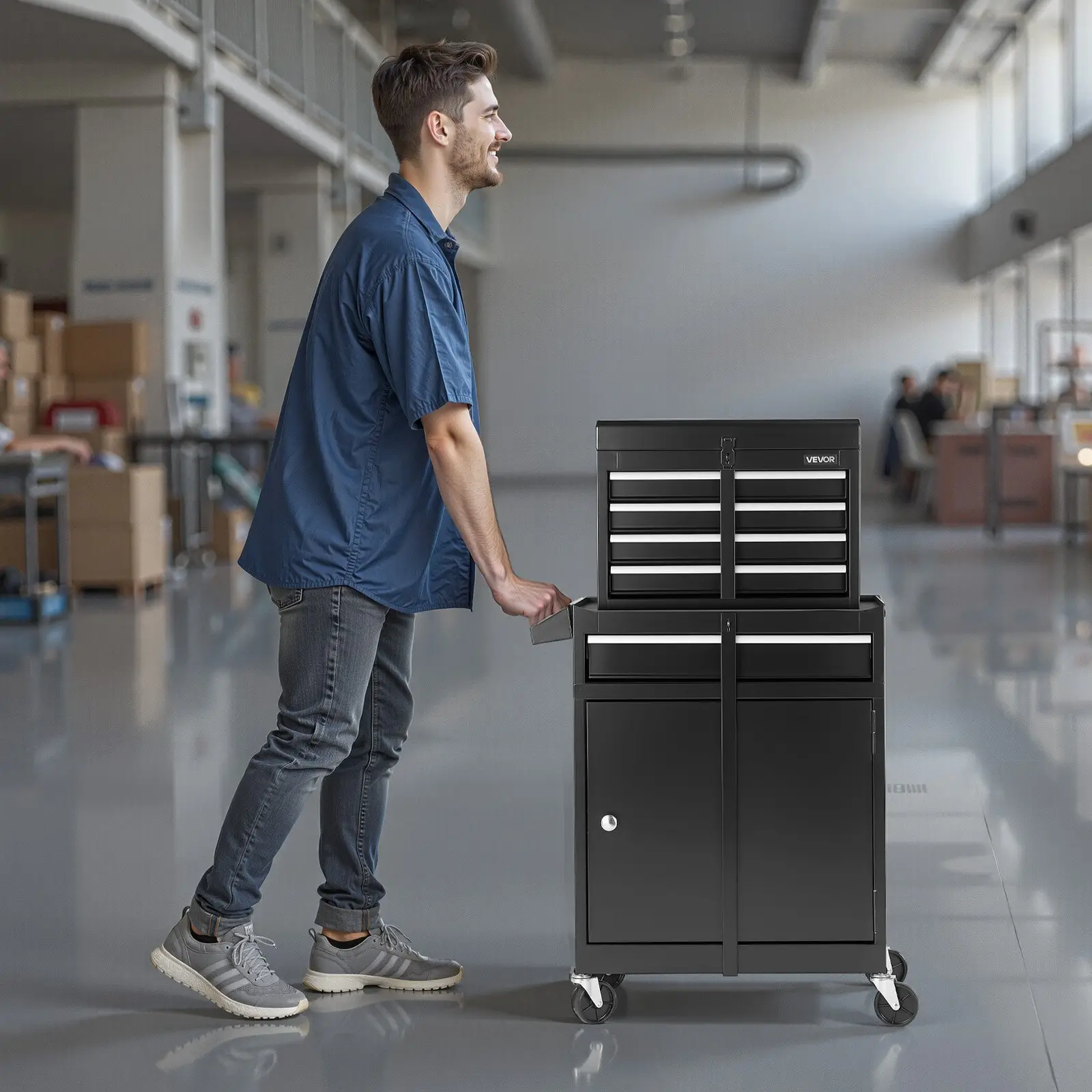 Detachable 2-in-1 Design: This rolling tool chest can be detached into independent tool chests and rolling cabinets, or used in combination.It is ideal for garage work and factory workshops, keeps tools organized, and meets various tool storage needsAll-Steel & EVA Protection: Made of cold-rolled steel with a powder-coated surface, the rolling tool cabinet resists corrosion, rust, and wear.The built-in EVA padding reduces vibration, noise, and metal tool collisions to ensure the items' longevitySwivel Casters with Brakes: Our rolling tool storage cabinet features four 360° swivel casters, and two of them with brakes for easy movement.The locking bar can synchronously lock drawers and cabinet doors to keep them from opening when movingHook & Perforated Panel Expansion: The rolling tool chest with drawers features a perforated panel, 3 galvanized hooks, and a tool-hole handle.It allows hanging and storing small tools, maximizing vertical space and improving access efficiencyEasy Assembly & Versatile Use: This stand up tool box adopts a pre-assembled design with the fixed top chest.Just attach the casters, shelf, and screwdriver rack, then lift the top chest onto the cabinet.Ideal for garage, workshop, and studio storageVEVOR Rolling Tool Chest, 2-in-1 Design, 5 Drawers Tool Cabinet Organizer with Detachable Top Metal Toolbox, Lock Bar, Protective Liner, and Tools Rack, Garage Storage Cabinet for Warehouse, Workshop