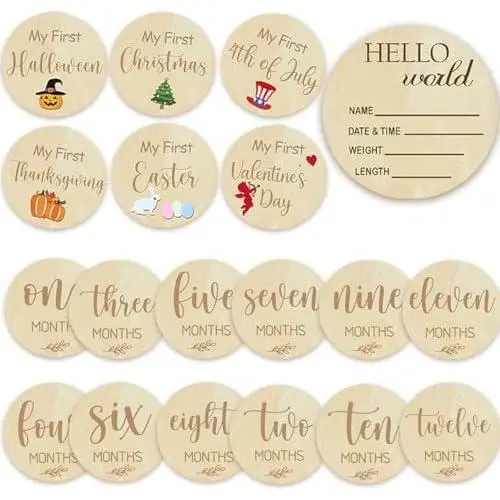 Double-Sided Design : This set includes 10 double-sided wooden cards-6 monthly milestone cards, 3 "My Holiday" boards, and 1 announcement sign, allowing you to capture essential details like height and weight while marking important growth milestones.