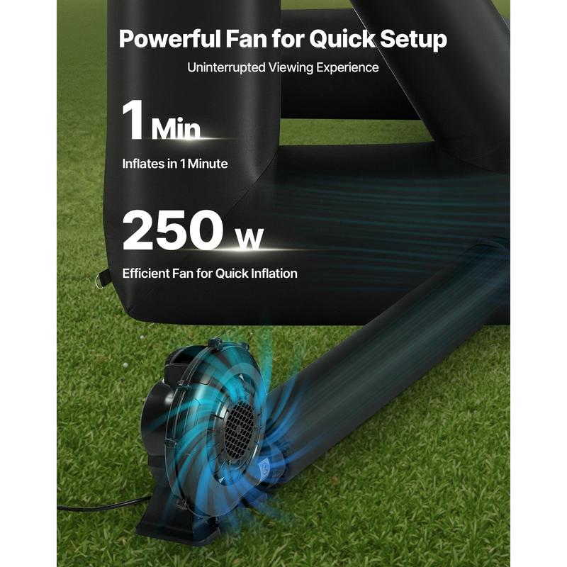 High-quality Material: This inflatable projector screen for outside uses high-quality Oxford fabric, which can resist creases and is easy to clean, ensuring clear, high-resolution images every time.The screen size is 10.46 x 5.97 ft. Front and rear projection are available with an aspect ratio of 16:9Instant Setup: Our inflatable projector screen is equipped with an efficient, 250W low-noise blower that can inflate the screen in just one minute, saving you valuable time.The low-noise design won't disrupt your peaceful movie nights with family or neighbors.Expansive Viewing Angle: With its wide-angle design, our inflatable screen allows multiple people to enjoy movie nights simultaneously.No matter where you sit, you can easily enjoy a wide viewing angle, immersing yourself in a comprehensive audio-visual experience!Effortless Cleaning: The screen is water washable for easy cleaning, made of high-strength Oxford fabric, non-deformation, and stain-resistant.Save time and labor for you.The screen is detachable with magic tape, more accessible to reassemble than traditional buckle-typed screens.Various Applications: The projector screen is ideal for indoor and outdoor use, such as poolside, backyard, weddings, festive events, and parties.You can enjoy a fantastic night with people in the backyard, the beach, or have a camping adventure in the woods.VEVOR 16FT Inflatable Projector Screen, Inflatable Movie Screen Outdoor with 250W Air Blower Projector Screen Oxford Fabric Material Blow Up Screen for Outdoor Backyard, Home Theater, Theme Party