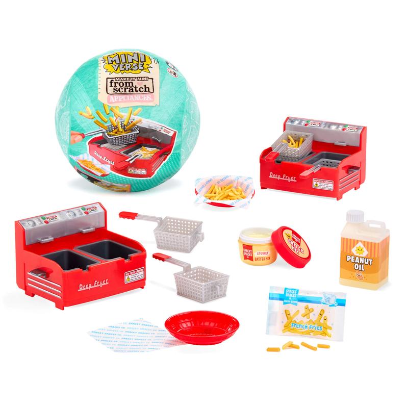 Get ready to turn up the tiny fun with Make It Mini From Scratch Appliances—all-new mini machines that actually work! Each surprise ball includes one real working mini appliance, plus all the accessories and ingredients you need to create your mini food replica. Appliances come in four styles—Waffle Makers, Rice Cookers, Blenders, and Fryers—each available in two colors, for a total of 8 mini machines to collect. These appliances don’t just look cute—they function like the real thing. Blend your mini “smoothies” with the blender, whip up tiny “rice” in the rice cooker, fry up make-believe “donuts” in the fryer, or press perfect mini waffles in the waffle maker. Each machine features unique working elements to level up your Miniverse experience. Once you’ve made your minis, let them air dry according to the times listed on the included “recipe” cards. After they’re set, you’ll have a perfectly crafted mini collectible ready to display. Your Make It Mini From Scratch ingredients can be used with these Series 3 Appliances! Mix, match, and create across both lines for the ultimate Miniverse kitchen adventure. There are 8 unique styles to collect! The image on the front of each ball reveals which appliance is inside—but the color is a surprise, making every unboxing even more fun.