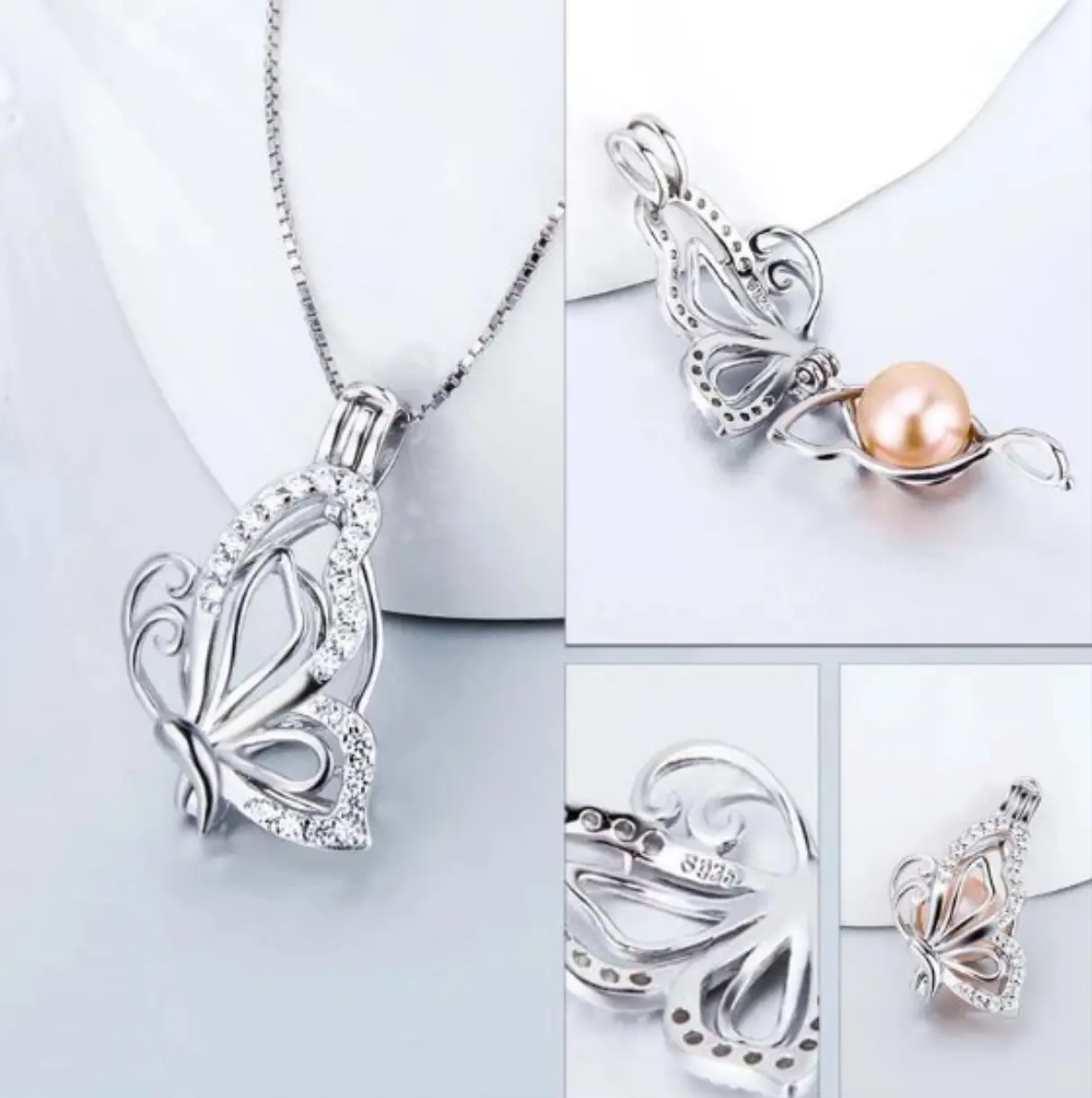 5. Dazzling 925 Sterling Silver Zircon Butterfly Pearl Cage Pendant Necklace