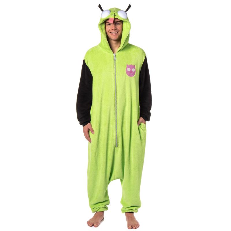 Get ready to conquer the universe of comfort and style with the Invader Zim Men's Gir Hooded Union Suit Character Costume Sleep Pajama! Made for adult fans of the beloved animated series, this union suit brings the beloved character Gir to life in cozy Kigurumi style. Crafted from 100% polyester, this sleepwear ensemble ensures maximum comfort and durability for all-night adventures in dreamland. Whether relaxing on the couch, attending a cosplay event, or preparing for a marathon of the animated series, this union suit will surely delight fans of all ages. These union suits make great birthday or Christmas presents! Embody Gir's Playful Spirit: Transform into the lovable robot Gir with this hooded union suit, complete with 3-D eyes, ears, tongue, and embroidered nose, capturing every detail of the character. Premium Quality Construction: Made from soft, top-notch polyester fabric, this union suit offers a luxurious feel against your skin, ensuring a comfortable and cozy fit all night long. For visual reference our model is 5 feet and 10 inches tall and is wearing a size S/M. For best fit please follow our sizing chart in the listing. Convenient Design Features: This union suit features a front plastic zipper closure and cuffed arms and legs. It offers easy on-and-off access and is great for lounging, sleeping, or costume parties. Detailed Hood Design: The decorated hood showcases Gir's distinctive features, including his expressive eyes and perky ears, making you instantly recognizable as the mischievous robot from Invader Zim. Eye-Catching Embroidered Patch: Stand out from the crowd with the embroidered patch design of Gir's sidekick, Pig, adorning the front of the suit. This adds a touch of whimsy to your sleepwear ensemble.