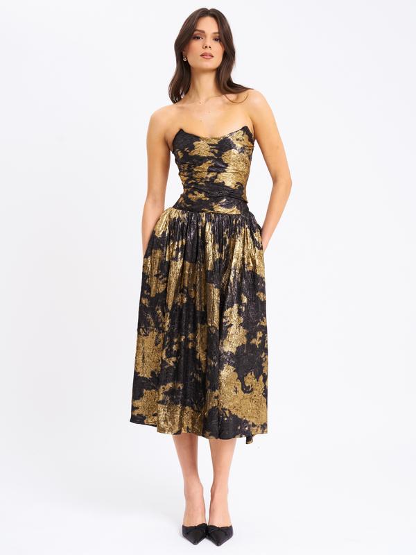 Saanvi Gold Tie Dye Bronzing Strapless Drop Waist Midi Dress