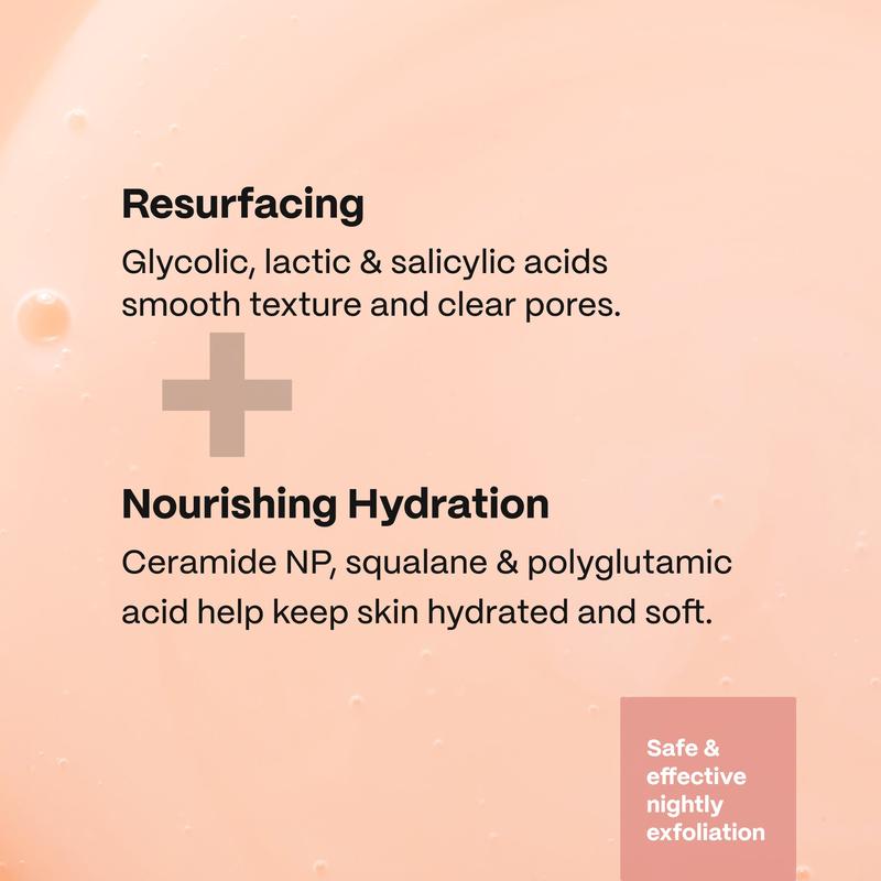A treatment-strength overnight exfoliating formula that smooths and refines skin while respecting the skin barrier — delivering visible results without the dryness, flaking, or recovery days often associated with exfoliation. Powered by glycolic, lactic, and salicylic acids, this silky milk formula visibly smooths texture, refines pores, and helps even skin tone.