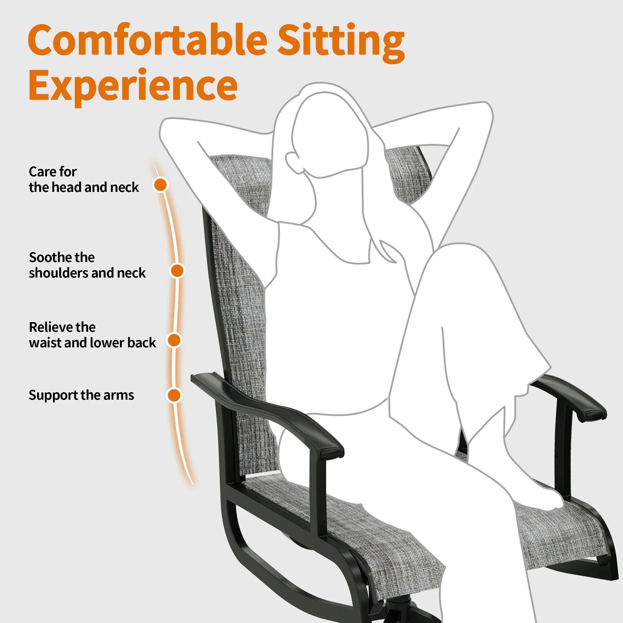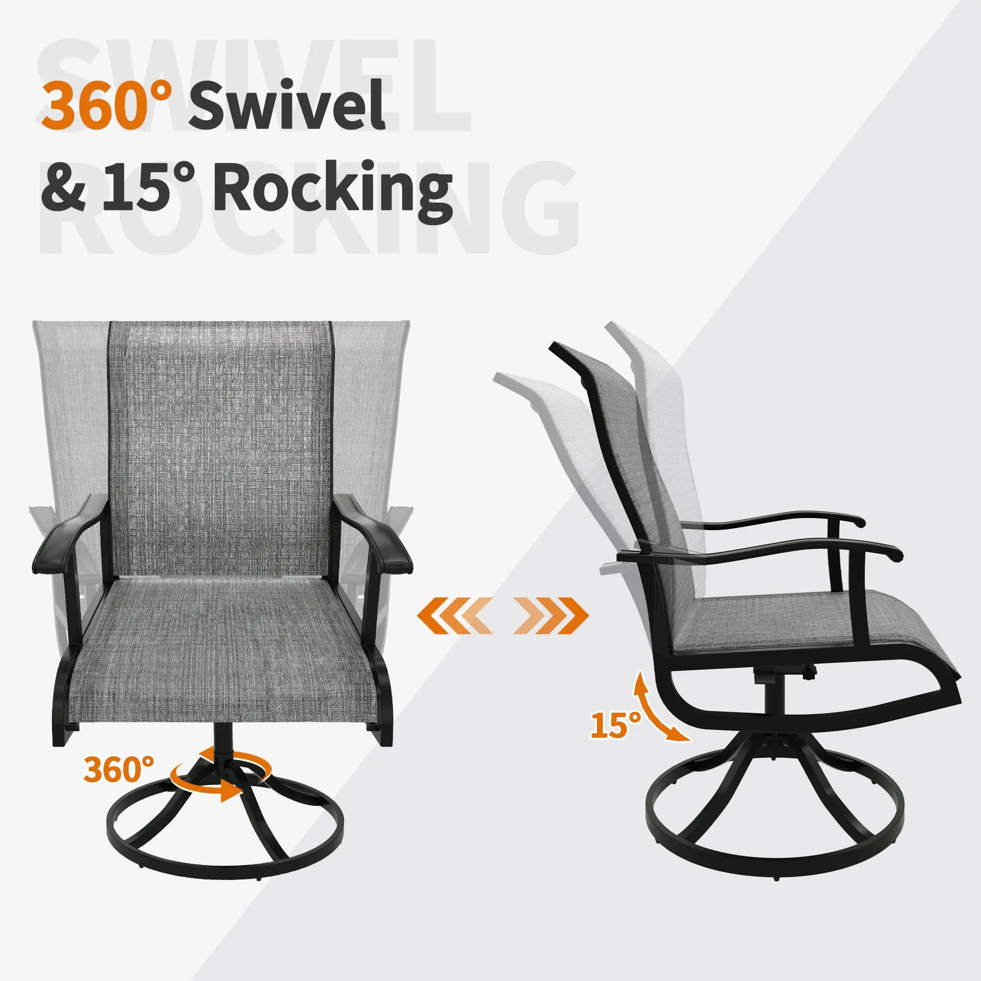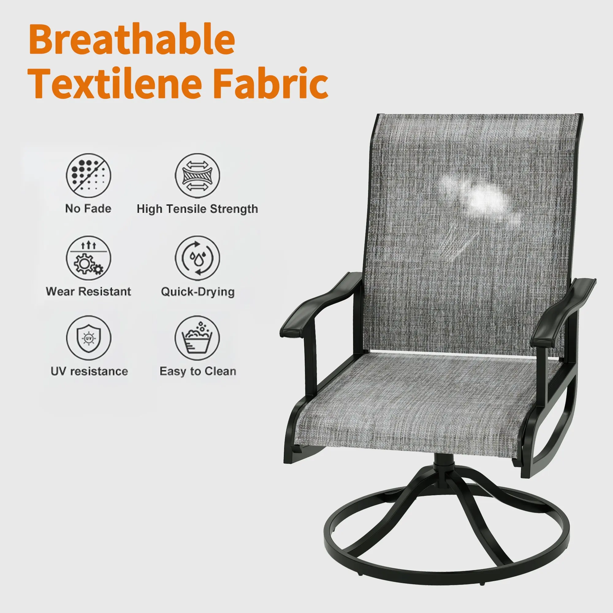 ·Breathable Textilene Fabric: Made from durable, breathable, and elastic Textilene fabric, this swivel outdoor chair is UV-resistant and quick-drying, making it perfect for various weather conditions while ensuring long-lasting use.