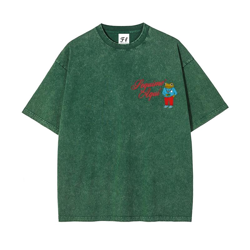 Seguimo Aqui Sapo Concho T Shirt is a Reggaeton-inspired piece, perfect for Perreo Babe enthusiasts. This Puerto Rican DTMF-inspired shirt features a bold design with "Mientras uno está vivo, uno debe amar lo más que pueda" printed in red. The front showcases a playful "Seguimos Aquí" graphic with a blue character. Ideal for those who love vibrant, cultural fashion.