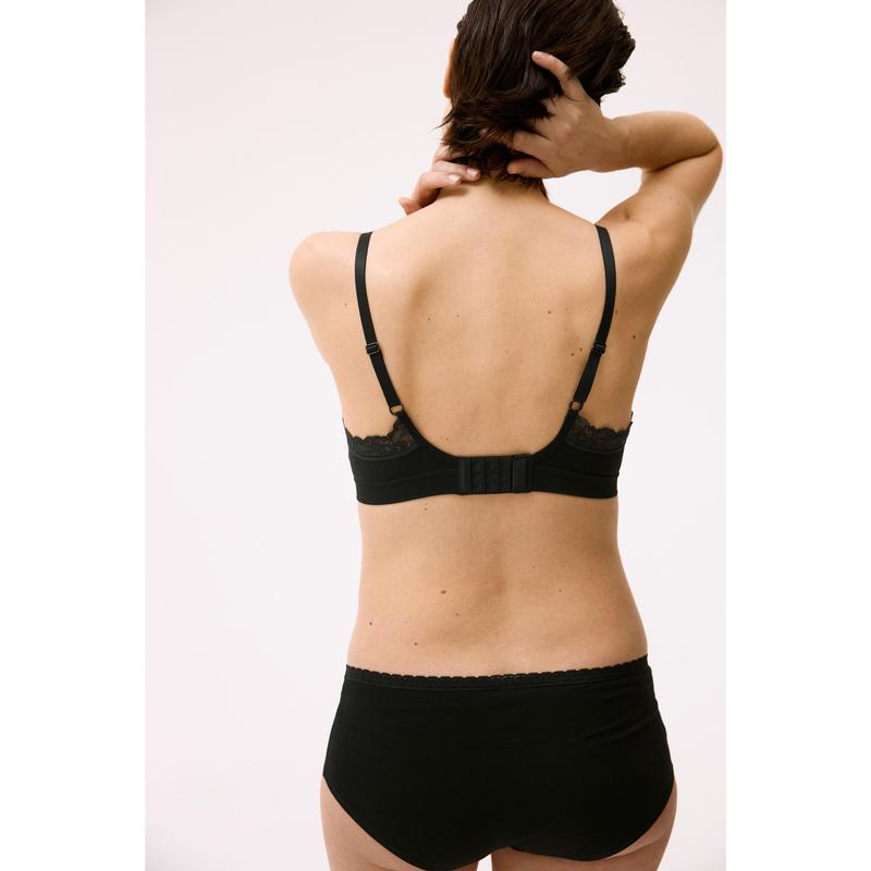 Soft, non-wired nursing bras in jersey with a lace trim at the top. Adjustable shoulder straps and lined, opening cups with removable inserts and space for nursing pads. Hook-and-eye fastening at the back.