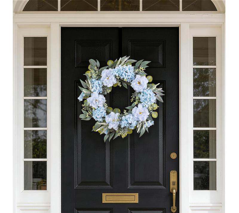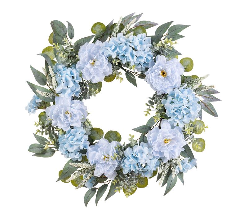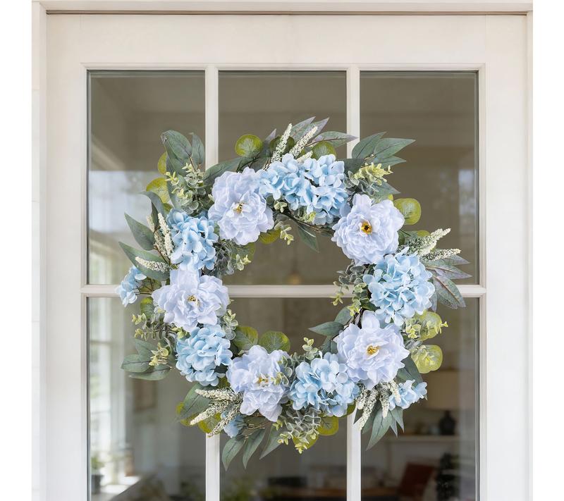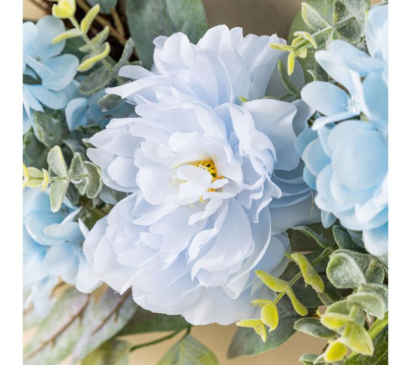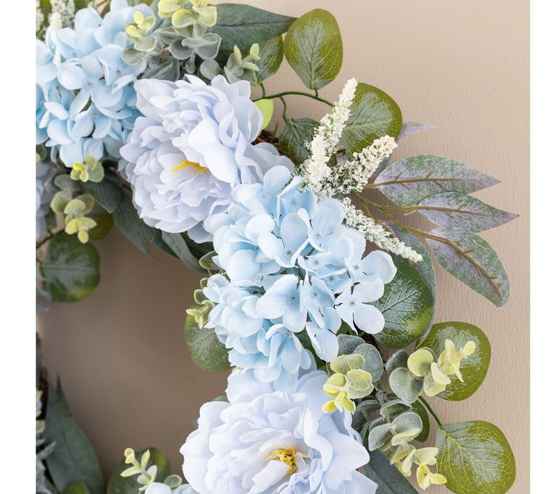 Bring a soothing touch to your space with this floral wreath, showcasing lifelike blue peonies and hydrangeas nestled among lush foliage. The serene blue tones instantly freshen up your front door or wall, while the included metal hanger lets you display it with ease -- no fuss, just effortless elegance all season long. From Glitzhome.