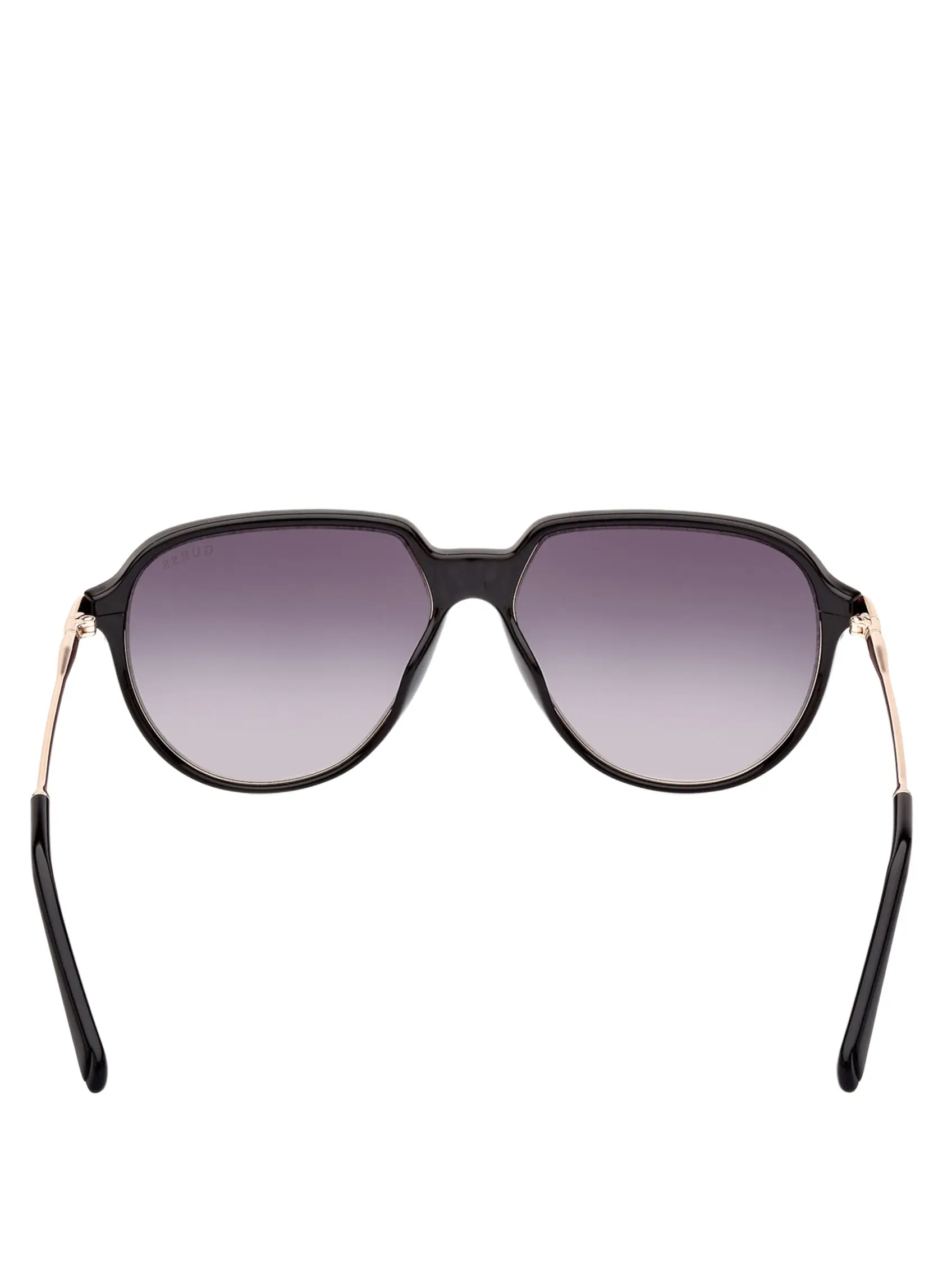 An unexpected aviator style, this pair of sunglasses is designed with transparent plastic frames, tinted lenses and metal arms with plastic tips.
