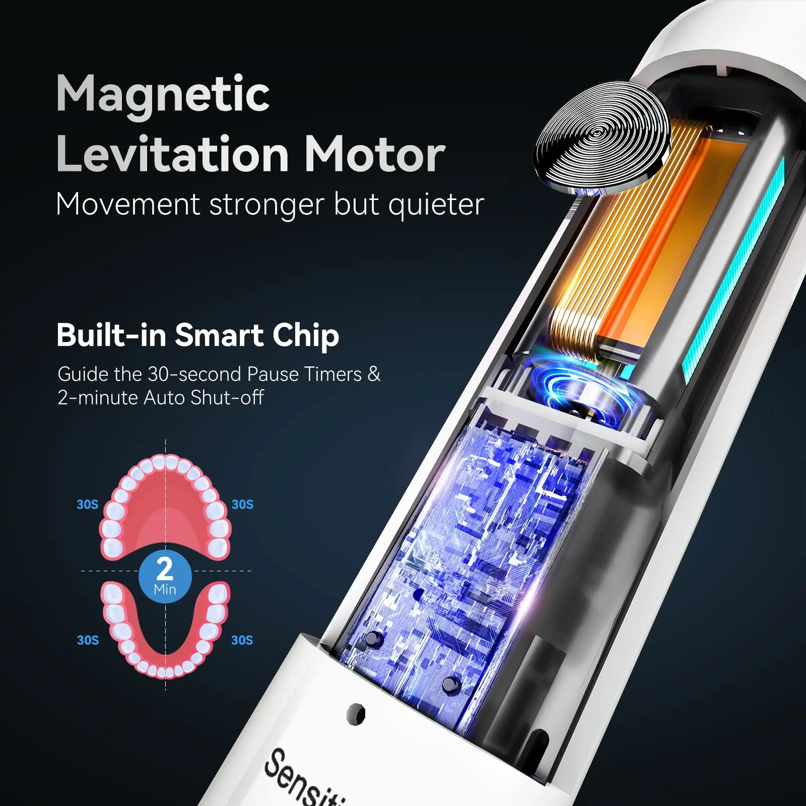 2-minute smart timer with pause every 30 seconds: prompts you to change brushing zones; scientific brushing experience to help you develop good brushing habits;
