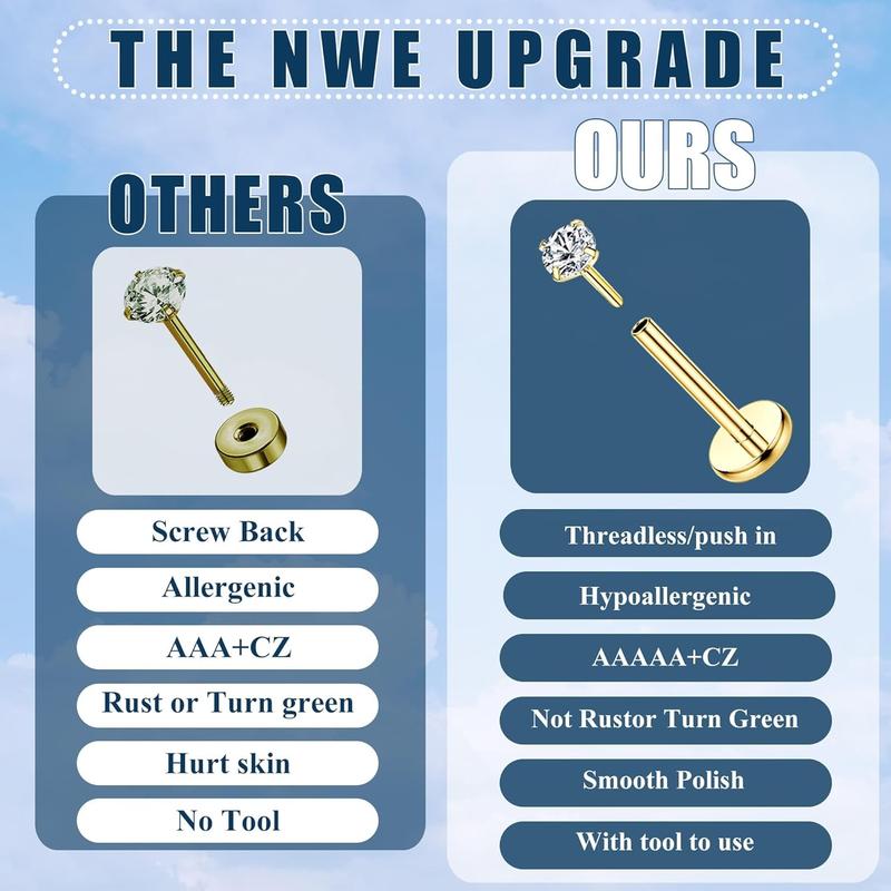 ·Hypoallergenic Flat Back Studs: These studs Made Of Stainless Steel,which is the ideal choice If you have sensitive skin.Our flat back nose stud has passed The Anti-allergy Test, Waterproof Test. Nickel and lead-safe,non-irritating, the push in earrings stud with smooth polished surface, surface electroplating 14K plated gold, safe and durable,never turn your skin green, designed to prevent irritation and discomfort for extended wear.