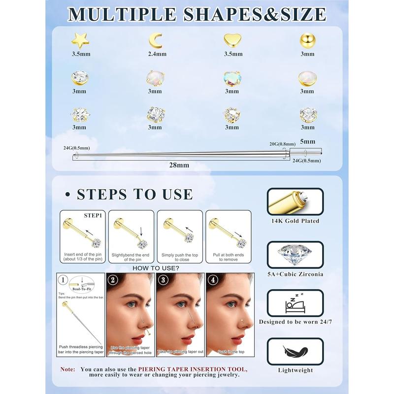·Multiple Nose Rings : Gauge size: 18G(1.0mm),20G(0.8mm),16G(1.2mm),bar length: 6mm.One order includes 12 pcs nose studs&1PCS Taper Insertion Pin in a package ,12PCS different styles of Threadless Ends,Whether it's stars, hearts, balls or the moon, you can always find one that you like.Wear it, whether it is usually or party, you will be the most shining focus.